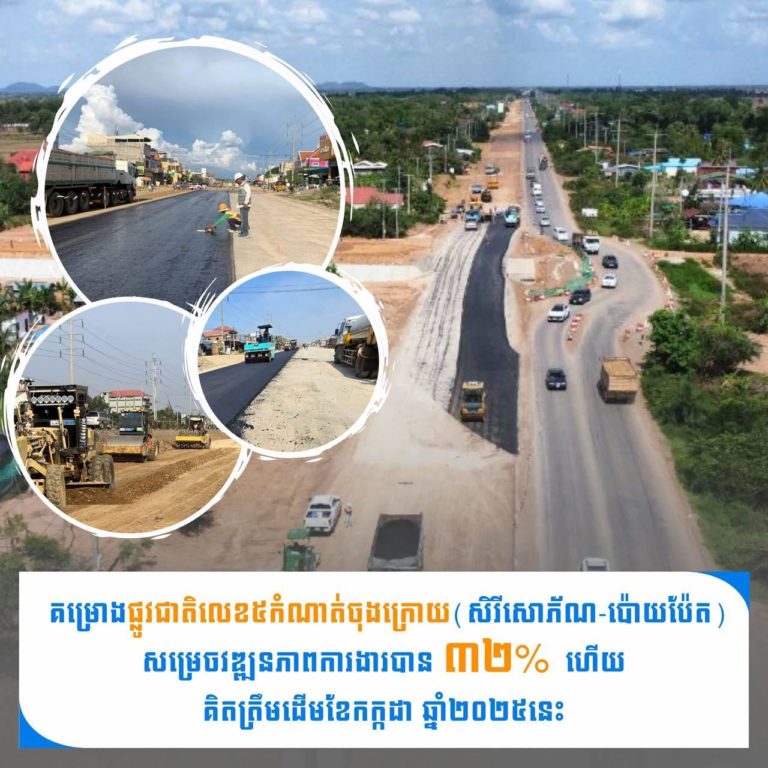 (បន្ទាយមានជ័យ)៖ កំណាត់ចុងក្រោយ នៃគម្រោងសាងសង់ផ្លូវជាតិលេខ៥ ពី សិរីសោភ័ណ-ប៉ោយប៉ែត ខេត្តបន្ទាយមានជ័យ មានប្រវែង ៣៥,១៤ គីឡូម៉ែត្រ សម្រចបានលទ្ធផលជារួម ៣២% ហើយ គិតត្រឹមដើមខែកក្កដា ឆ្នាំ២០២៥នេះ។ បើគ្មានការប្រែប្រួលទេ កំណាត់ផ្លូវជាតិលេខ៥ នៃគម្រោងស្តារ និងលើកកម្រិតគុណភាពផ្លូវជាតិលេខ៥ កំណាត់ចុងក្រោយនេះ គ្រោងនឹងបញ្ចប់ក្នុងអំឡុងឆ្នាំ២០២៦ ខាងមុខ។