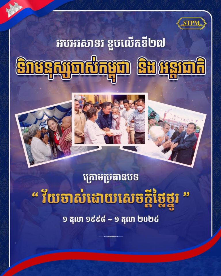 (ភ្នំពេញ)៖ សម្តេចបវរធិបតី ហ៊ុន ម៉ាណែត នាយករដ្ឋមន្ត្រីនៃកម្ពុជា នៅព្រឹកថ្ងៃទី១ ខែតុលា ឆ្នាំ២០២៥នេះ បានបង្ហោះសារអបអរសាទរខួបលើកទី២៧ ទិវាមនុស្សចាស់កម្ពុជា និងទិវាមនុស្សចាស់អន្តរជាតិ ក្រោមប្រធានបទ៖ «វ័យចាស់ដោយសេចក្ដីថ្លៃថ្នូរ»។
