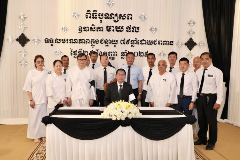 (ភ្នំពេញ)៖ ឯកឧត្តមឧត្តមសេនីយ៍ឯក យឹម លាង អគ្គស្នងការរងនគរបាលជាតិ តំណាងឯកឧត្តមនាយឧត្តមសេនីយ៍ ស ថេត អគ្គស្នងការនគរបាលជាតិ នៅថ្ងៃទី៣០ ខែកញ្ញា ឆ្នាំ២០២៥ បានដឹកនាំគណៈប្រតិភូអគ្គស្នងការដ្ឋាននគរបាលជាតិ អញ្ជើញចូលរួមគោរពវិញ្ញាណក្ខន្ធ និងរំលែកមរណទុក្ខដ៏ក្រៀមក្រំជាមួយក្រុមគ្រួសារសព ឧបាសិកាពុទ្ធសាសនូបត្ថម្ភក៏ មាឃ ផល ដែលត្រូវជាម្ដាយបង្កើត ម្ដាយក្មេក ឯកឧត្តម ឡាយ សំកុល អគ្គលេខាធិការ នៃអគ្គលេខាធិការដ្ឋានព្រឹទ្ធសភា និងលោកជំទាវ ជា ចាន់ឌី ដោយបានទទួលមរណភាពនៅថ្ងៃចន្ទ ៧កើត ខែអស្សុជ ឆ្នាំម្សាញ់ សប្តស័ក ព.ស.២៥៦៩ ត្រូវនឹងថ្ងៃទី២៩ ខែកញ្ញា ឆ្នាំ២០២៥ ក្នុងជន្មាយុ៧៩ឆ្នាំ ដោយជរាពាធ។