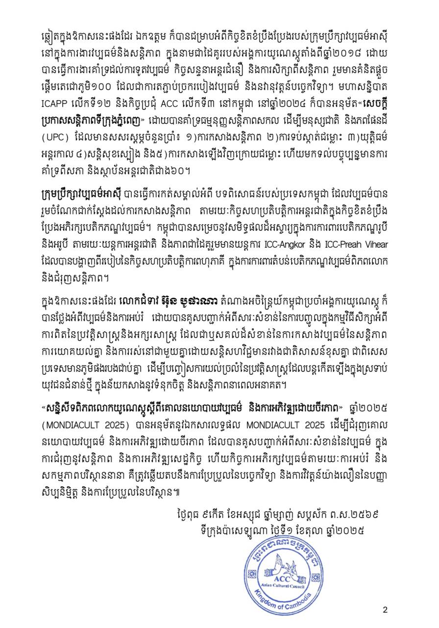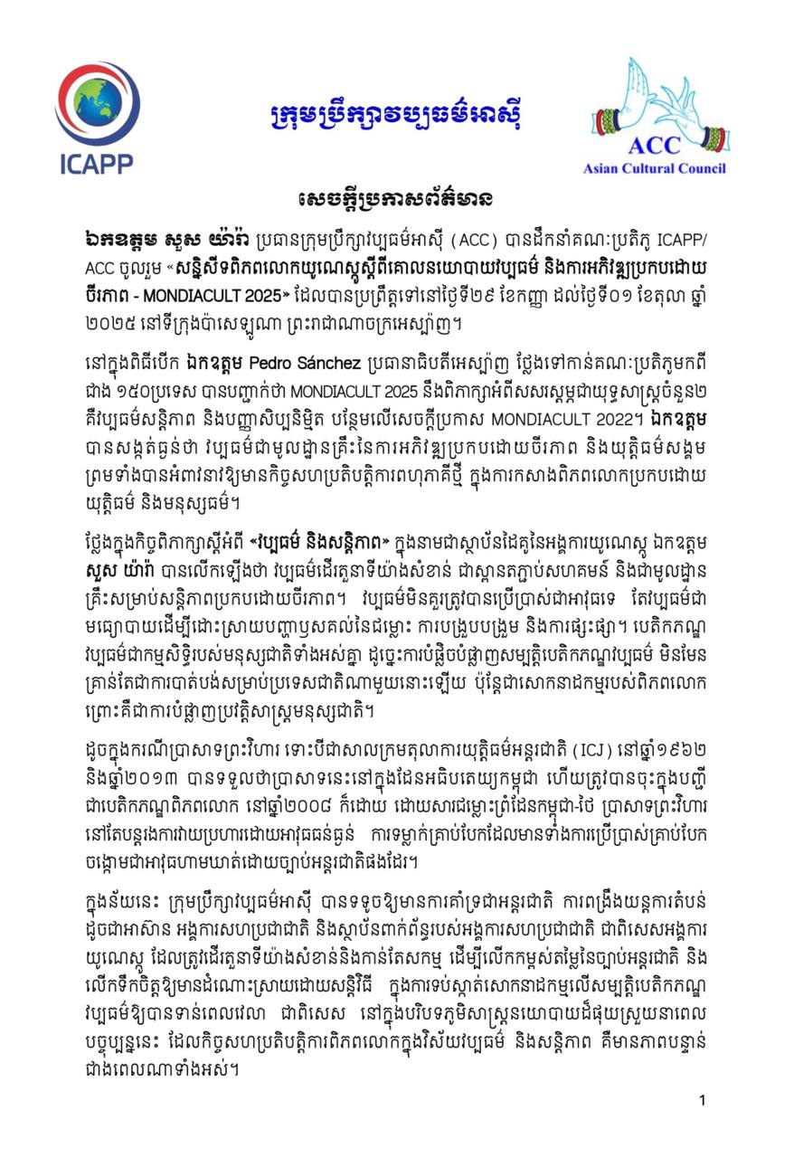 ឯកឧត្តម សួស យ៉ារ៉ា ប្រធានក្រុមប្រឹក្សាវប្បធម៌អាស៊ី (ACC) បានដឹកនាំគណៈប្រតិភូ ICAPP / ACC ចូលរួម «សន្និសីទពិភពលោកយូណេស្កូស្តីពីគោលនយោបាយវប្បធម៌ និងការអភិវឌ្ឍប្រកប ដោយចីរភាព – MONDIACULT 2025» ដែលបានប្រព្រឹត្តទៅនៅថ្ងៃទី២៩ ខែកញ្ញា ដល់ថ្ងៃទី០១ ខែតុលា ឆ្នាំ២០២៥ នៅទីក្រុងប៉ាសេឡូណា ព្រះរាជាណាចក្រអេស្ប៉ាញ។