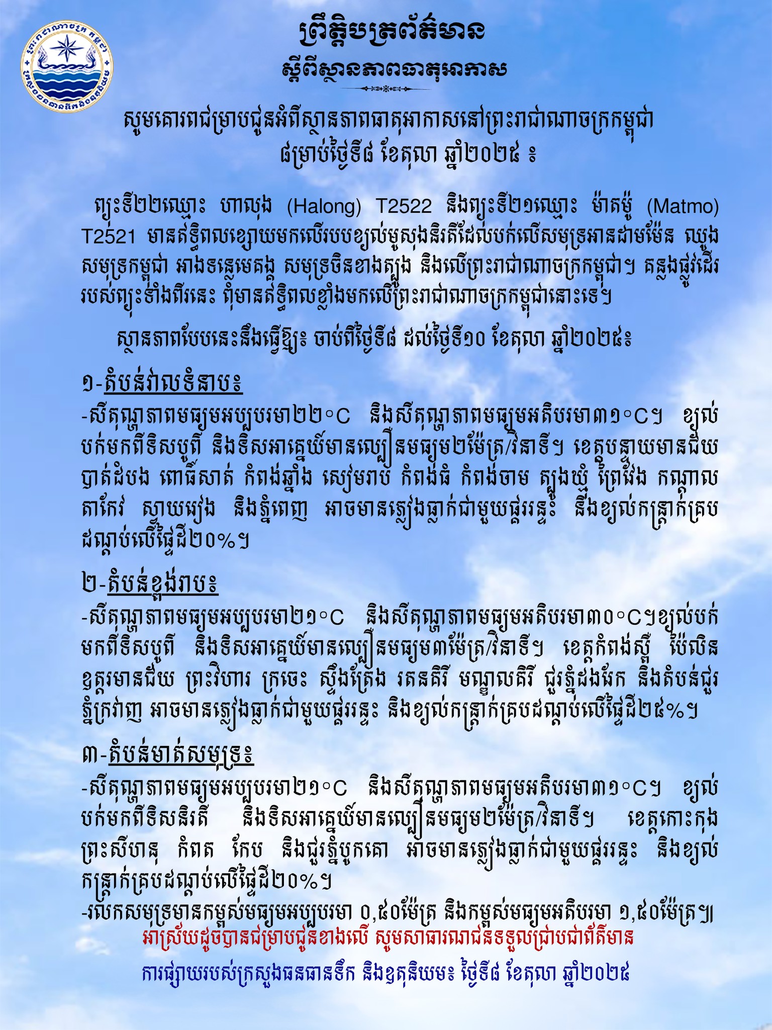 (ភ្នំពេញ)៖ ក្រសួងធនធានទឹក និងឧតុនិយម បានចេញសេចក្តីជូនដំណឹង អំពីស្ថានភាពធាតុអាកាសនៅកម្ពុជា សម្រាប់ថ្ងៃទី៨ ខែតុលា ឆ្នាំ២០២៥។