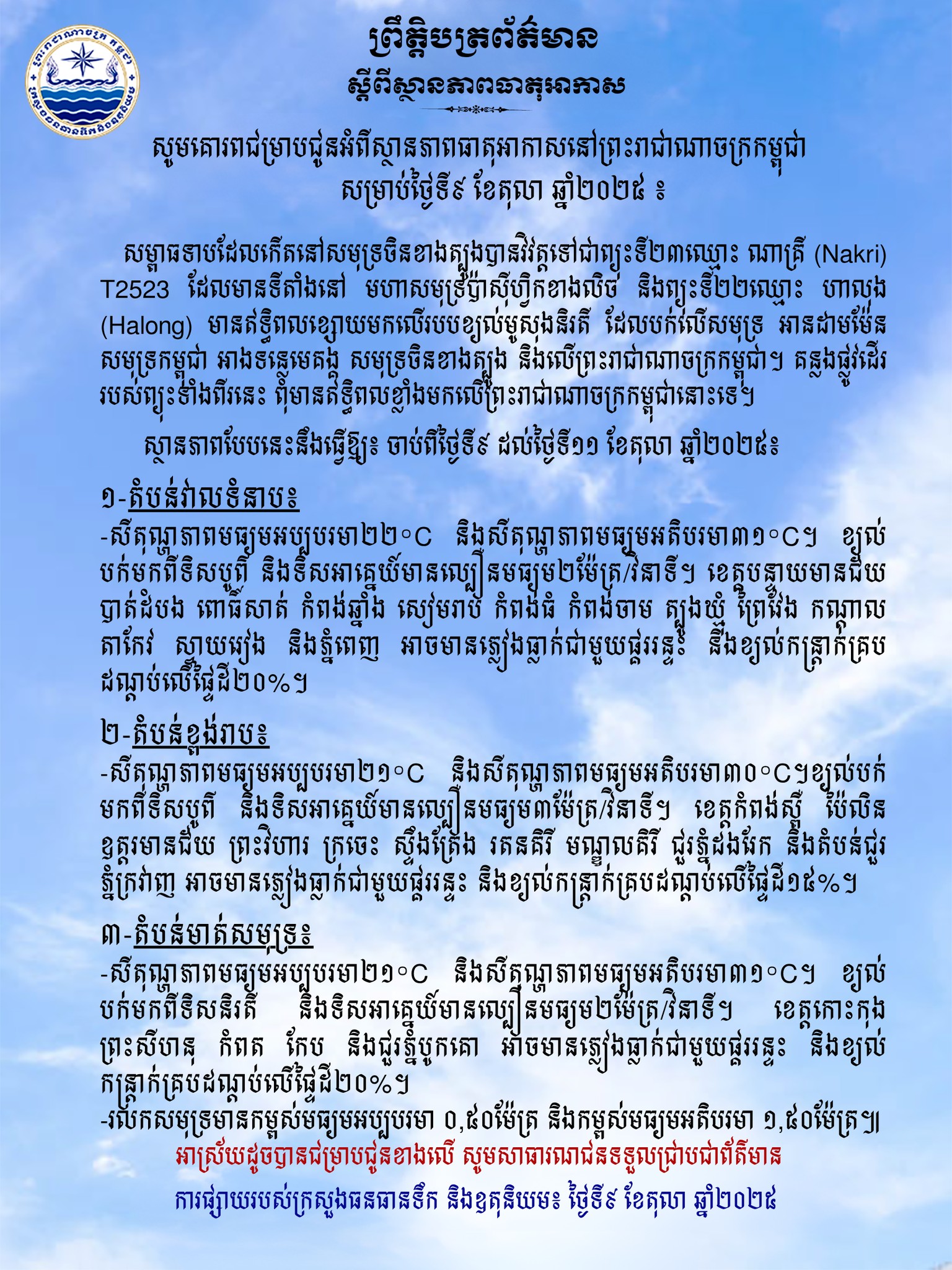 (ភ្នំពេញ)៖ ក្រសួងធនធានទឹក និងឧតុនិយម បានចេញសេចក្តីជូនដំណឹង អំពីស្ថានភាពធាតុអាកាសនៅកម្ពុជា សម្រាប់ថ្ងៃទី៩ ខែតុលា ឆ្នាំ២០២៥។