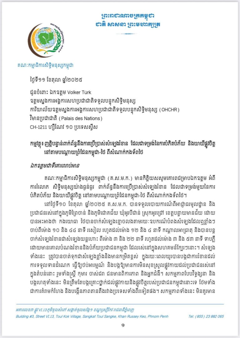 គណៈកម្មាធិការសិទ្ធិមនុស្សកម្ពុជា ប្តឹងទៅឧត្តមស្នងការអង្គការសហប្រជាតិទទួលបន្ទុកសិទ្ធិមនុស្ស ពាក់ព័ន្ធនឹងការប្រើប្រាស់សំឡេងរំខាន ដែលជាទម្រង់នៃការបំភិតបំភ័យ និងយាយីផ្លូវចិត្តនៅតាមបណ្ដោយព្រំដែនកម្ពុជា-ថៃ ពីសំណាក់កងទ័ពថៃ។