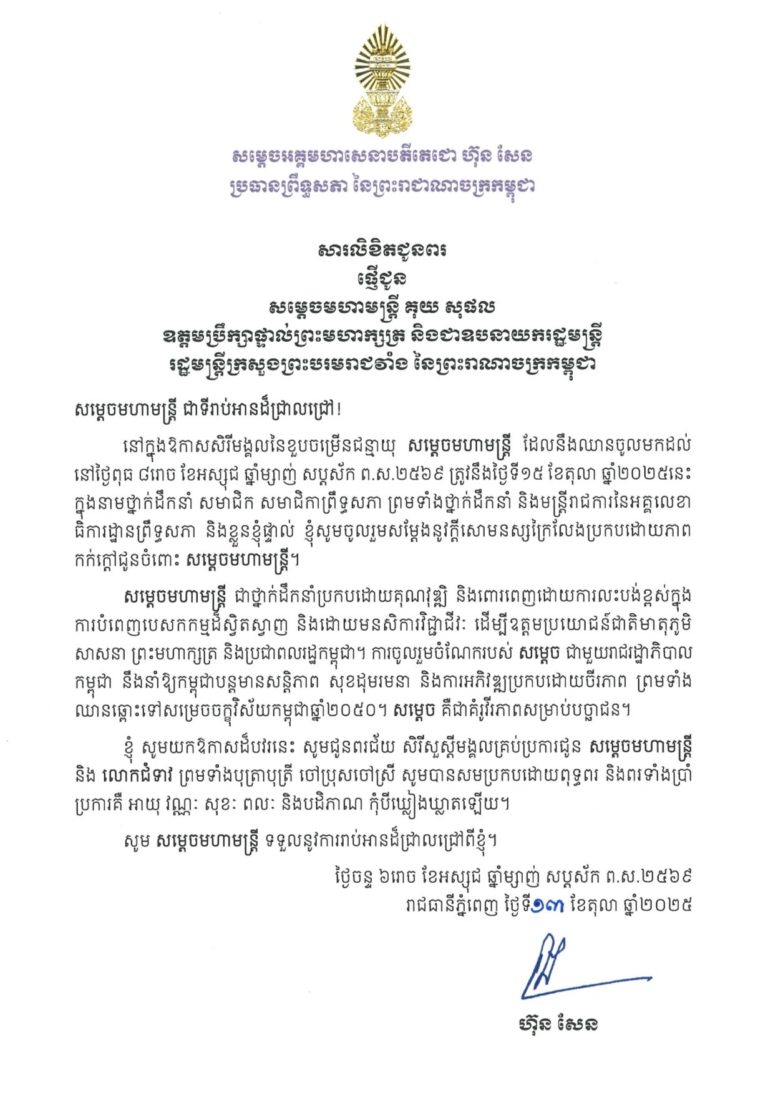 ក្នុងសារលិខិតជូនពរ បានសរសេរយ៉ាងដូច្នេះថា «នៅក្នុងឱកាសសិរីមង្គល នៃខួបចម្រើនជន្មាយុ សម្តេចមហាមន្ត្រី ដែលនឹងឈានចូលមកដល់ នៅថ្ងៃពុធ ៨រោច ខែអស្សុជ ឆ្នាំម្សាញ់ សប្តស័ក ព.ស.២៥៦៩ ត្រូវនឹងថ្ងៃទី១៥ ខែតុលា ឆ្នាំ២០២៥នេះ ក្នុងនាមថ្នាក់ដឹកនាំ សមាជិក សមាជិកាព្រឹទ្ធសភា ព្រមទាំងថ្នាក់ដឹកនាំ និងមន្ត្រីរាជការនៃអគ្គលេខាធិការដ្ឋានព្រឹទ្ធសភា និងខ្លួនខ្ញុំផ្ទាល់ ខ្ញុំសូមចូលរួមសម្តែងនូវក្តីសោមនស្ស ក្រៃលែងប្រកបដោយភាព កក់ក្តៅជូនចំពោះ សម្តេចមហាមន្ត្រី។