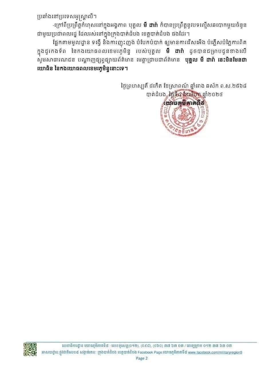 សេចក្តីបំភ្លឺព័ត៌មានរបស់អង្គភាពយោធភូមិភាគទី៥ កងទ័ពជើងគោកនៃកងយោធពលខេមរភូមិន្ទ