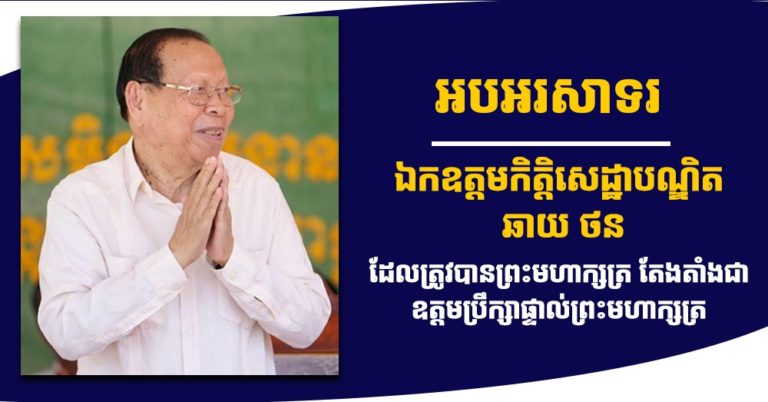 យើងខ្ញុំ មានសេចក្តីសោមនស្សរីករាយក្រៃលែង និងសូមចូលរួមអបអរ សាទរចំពោះ ឯកឧត្តមកិត្តិសេដ្ឋាបណ្ឌិត ដែលត្រូវបាន ព្រះករុណា ព្រះបាទសម្តេចព្រះបរមនាថ នរោត្តម សីហមុនី ព្រះមហាក្សត្រ នៃព្រះរាជាណាចក្រកម្ពុជា ស្ដេចទ្រង់សព្វព្រះរាជហឫទ័យ ត្រាស់បង្គាប់តែងតាំងជា ឧត្តមប្រឹក្សាផ្ទាល់ព្រះមហាក្សត្រ នៃព្រះរាជាណាចក្រកម្ពុជា មានឋានៈស្មើ ឧបនាយករដ្ឋមន្ត្រី តាមព្រះរាជក្រឹត្យលេខ នស/រកត/១០២៥/១៣៣២ ចុះថ្ងៃទី១៦ ខែតុលា ឆ្នាំ២០២៥។