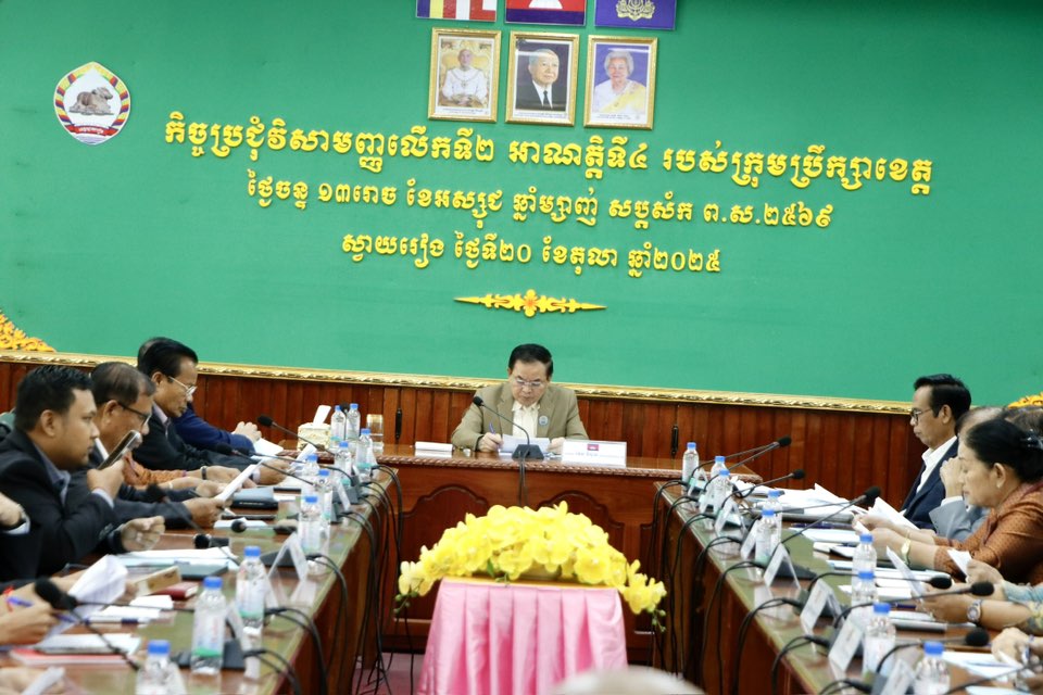 នាព្រឹកថ្ងៃ១៣រោច ខែអស្សុជ ឆ្នាំម្សាញ់ សប្តស័ក ព.ស២៥៦៩ ត្រូវនឹងថ្ងៃទី២០ ខែតុលា ឆ្នាំ២០២៥នេះ នៅសាលប្រជុំ នន្ទីរអាគារ ខ សាលាខេត្ត មានរៀបចំកិច្ចប្រជុំវិសាមញ្ញលើកទី២ អាណត្តិទី៤ របស់ក្រុមប្រឹក្សាខេត្ត ក្រោមអធិបតីភាពឯកឧត្តម ម៉ែន វិបុល ប្រធានក្រុមប្រឹក្សាខេត្ត និងមានការអញ្ជើញចូលរួមពីឯកឧត្តម ប៉េង ពោធិ៍សា អភិបាល នៃគណៈអភិបាលខេត្ត ឯកឧត្ដម លោកជំទាវសមាជិក សមាជិកាក្រុមប្រឹក្សាខេត្ត អភិបាលរងខេត្ត លោកនាយករដ្ឋបាលសាលាខេត្ត និងលោកនាយករងទីចាត់ធនធានមនុស្សស្តីទីសាលាខេត្ត។