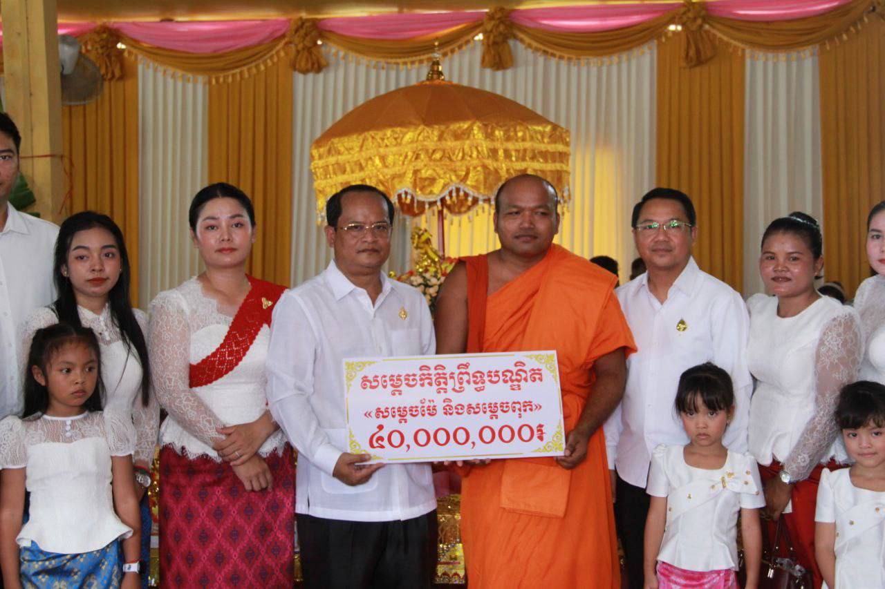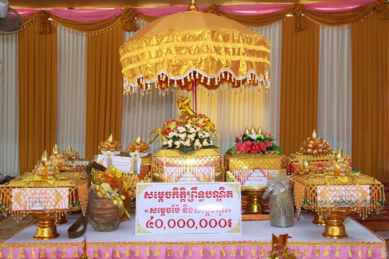 សរុបបច្ច័យអង្គកឋិនទានទាំងមូលបានចំនួន ៨១លានរៀល ដែលក្នុងនោះបច្ច័យដ៏ខ្ពង់ខ្ពស់របស់ សម្តេចកិត្តិព្រឹទ្ធបណ្ឌិត ប៊ុន រ៉ានី ហ៊ុនសែន ចំនួន ៤០,០០០,០០០៛ សម្តេចកិត្តិសង្គហបណ្ឌិត ម៉ែន សំអន ៥,០០០,០០០៛ ឯកឧត្តមឧបនាយករដ្ឋមន្ត្រី ហ៊ុន ម៉ានី ៤,០០០,០០០៛ ឯកឧត្តម សួន សេរីរដ្ឋា និងលោកជំទាវ ព្រមទាំង វេទិកាសន្តិភាពកម្ពុជា ព្រមទាំង ឯកឧត្តម លោកជំទាវ លោកយាយ លោកតា ប្រជាពុទ្ធបរិស័ទ្ទពីទីជិតឆ្ងាយចំនួន ៣២,០០០,០០០៛ និងត្រៃធំ ត្រៃលាង សម្ភារៈជាច្រើនទៀតរួមាន សាប៊ូ ថ្នាំដុសធ្មេញ និងច្រាសដុសធ្មេញ បានវេរប្រគេនព្រះសង្ឃទកសម្រាប់ប្រើប្រាស បន្ទាប់ដង្ហែអង្គកឋិនទានប្រទាកក្សិន ៣ជុំព្រះវិហារ… ។