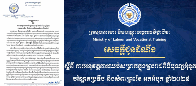 (ភ្នំពេញ)៖ ក្រសួងការងារ និងបណ្តុះបណ្តាលវិជ្ជាជីវៈ បានចេញសេចក្តីជូនដំណឹងស្តីពី ការអនុវត្តការឈប់សម្រាកក្នុងព្រះរាជពិធីបុណ្យអុំទូក បណ្តែតប្រទីប និងសំពះព្រះខែ អកអំបុកខាងមុខនេះ ក្នុងរយៈពេល៣ថ្ងៃ គឺថ្ងៃទី៤ ដល់ថ្ងៃទី៦ ខែវិច្ឆិកា ឆ្នាំ២០២៥ ដោយត្រូវអនុញ្ញាតឱ្យកម្មករនិយោជិតទាំងអស់ របស់ខ្លួនឈប់សម្រាកដោយមានប្រាក់ឈ្នួល។