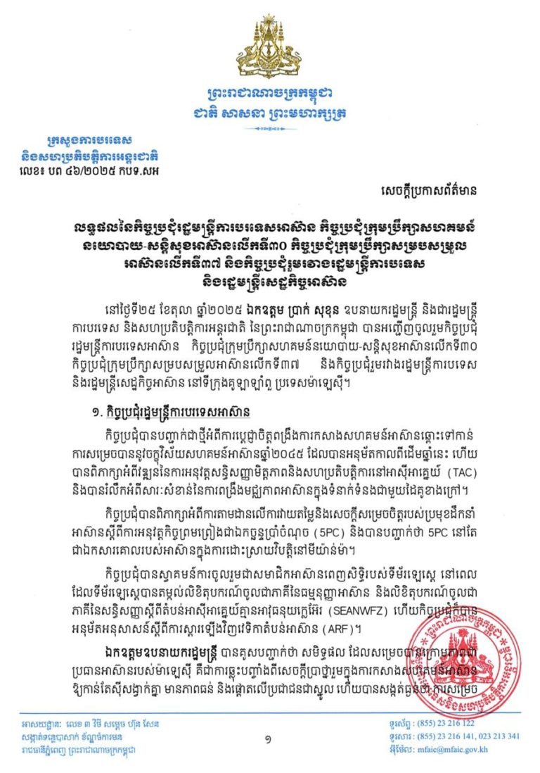 ក្រសួងការបរទេស និងសហប្រតិបត្តិការអន្តរជាតិ នៅល្ងាចថ្ងៃទី២៦ ខែតុលា ឆ្នាំ២០២៥នេះ បានប្រកាសលទ្ធផលនៃកិច្ចប្រជុំរដ្ឋមន្រ្តីការបរទេសអាស៊ាន កិច្ចប្រជុំក្រុមប្រឹក្សាសហគមន៍នយោបាយ-សន្តិសុខអាស៊ានលើកទី៣០ កិច្ចប្រជុំក្រុមប្រឹក្សាសម្របសម្រួលអាស៊ានលើកទី៣៧ និងកិច្ចប្រជុំរួមរវាងរដ្ឋមន្រ្តីការបទេស និងរដ្ឋមន្រ្តីសេដ្ឋកិច្ចអាស៊ាន។