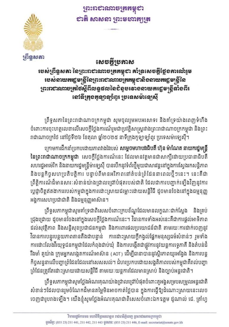 ព្រឹទ្ធសភាកម្ពុជា នៅយប់ថ្ងៃទី២៦ ខែតុលា ឆ្នាំ២០២៥នេះ បានចេញសេចក្តីប្រកាសចូលរួមអបអរសាទរ និងគាំទ្រយ៉ាងពេញទំហឹង ចំពោះការចុះហត្ថលេខាលើសេចក្តីថ្លែងការណ៍រួមជាប្រវត្តិសាស្ត្ររវាងព្រះរាជាណាចក្រកម្ពុជា និងព្រះរាជាណាចក្រថៃ នៅថ្ងៃទី២៦ ខែតុលា ឆ្នាំ២០២៥ នាទីក្រុងកូឡាឡាំពួរ ប្រទេសម៉ាឡេស៊ី។