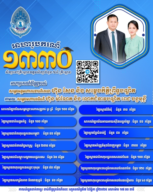 សម្តេចមហាបវរធិបតី ហ៊ុន ម៉ាណែត និងលោកជំទាវបណ្ឌិត ពេជ ចន្ទមុន្នី ហ៊ុនម៉ាណែត ផ្តល់អាហារូបករណ៍ដ៏ថ្លៃថ្លារបស់ សម្តេចអគ្គមហាសេនាបតីតេជោ ហ៊ុន សែន និងសម្តេចកិត្តិព្រឹទ្ធបណ្ឌិត (អ.ម.ត) នៅគ្រឹះស្ថានឧត្តមសិក្សាចំនួន១៤គ្រឹះស្ថាន ថ្នាក់សញ្ញាបត្របច្ចេកទេស ថ្នាក់បរិញ្ញាបត្ររង និងថ្នាក់បរិញ្ញាបត្រ សម្រាប់ឆ្នាំសិក្សា ២០២៥-២០២៦ ដោយមិនឆ្លងកាត់ការប្រឡង។