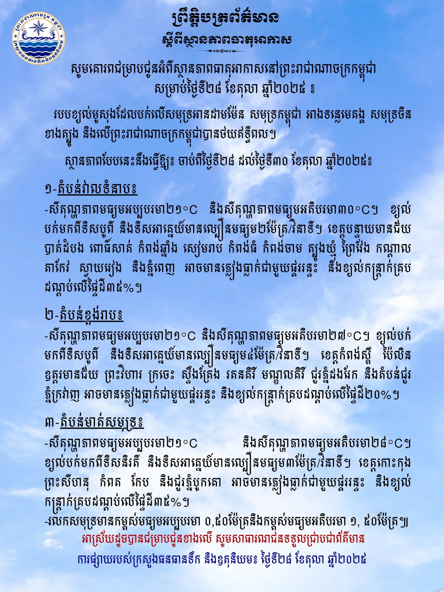 (ភ្នំពេញ)៖ ក្រសួងធនធានទឹក និងឧតុនិយម បានចេញសេចក្តីជូនដំណឹង អំពីស្ថានភាពធាតុអាកាសនៅកម្ពុជា សម្រាប់ថ្ងៃទី២៨ ខែតុលា ឆ្នាំ២០២៥។