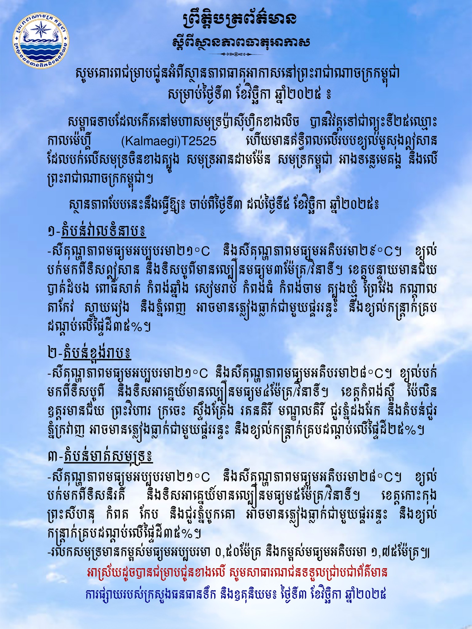 (ភ្នំពេញ)៖ ក្រសួងធនធានទឹក និងឧតុនិយម បានចេញសេចក្តីជូនដំណឹង អំពីស្ថានភាពធាតុអាកាសនៅកម្ពុជា សម្រាប់ថ្ងៃទី៣ ខែវិច្ឆិកា ឆ្នាំ២០២៥។