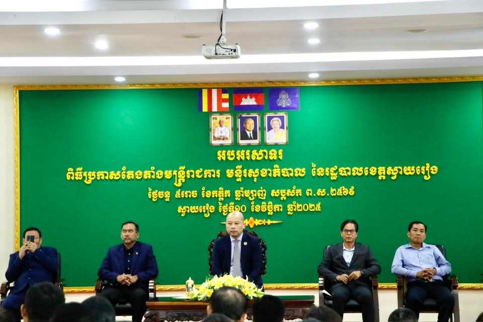 នាព្រឹកថ្ងៃទី១០ ខែវិច្ឆិកា ឆ្នាំ២០២៥នេះ ឯកឧត្តម ប៉េង ពោធិ៍សា អភិបាលនៃគណៈអភិបាលខេត្តស្វាយរៀង បានអញ្ជេីញជាអធិបតីក្នុងពិធីប្រកាសចូលកាន់មុខតំណែង មន្ត្រីរាជការមន្ទីរសុខាភិបាល នៃរដ្ឋបាលខេត្ត។