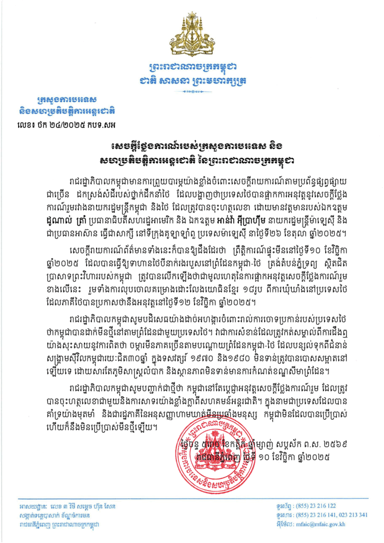 នៅយប់ថ្ងៃទី១០ ខែវិច្ឆិកា ឆ្នាំ២០២៥នេះ ក្រសួងការបរទេស និងសហប្រតិបត្តិការអន្តរជាតិ នៃព្រះរាជាណាចក្រកម្ពុជា បានចេញសេចក្តីថ្លែងការណ៍ស្តីអំពី ការព្រួយបារម្ភខ្លាំង ចំពោះសេចក្តីរាយការណ៍តាមប្រព័ន្ធផ្សព្វផ្សាយជាច្រើន ដកស្រង់សំដីរបស់ថ្នាក់ដឹកនាំថៃ ដែលបង្ហាញថាប្រទេសថៃបានផ្អាកការអនុវត្តនូវសេចក្តីថ្លែងការណ៍រួមរវាងនាយករដ្ឋមន្ត្រីកម្ពុជា និងថៃ។
