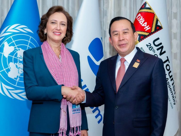 នាឱកាសដឹកនាំគណៈប្រតិភូជាន់ខ្ពស់ក្រសួងទេសចរណ៍ចូលរួមមហាសន្និបាតអង្គការទេសចរណ៍សហប្រជាជាតិលើកទី២៦ (UN Tourism- 26th General Assembly) នៅរាជធានីរីយ៉ាដ ឯកឧត្តម ហួត ហាក់ រដ្ឋមន្រ្តីក្រសួងទេសចរណ៍ នាថ្ងៃទី១០ ខែវិច្ឆិកា ឆ្នាំ២០២៥ បានជួបពិភាក្សាការងារជាមួយលោកស្រី Fatim-Zahra Ammor រដ្ឋមន្រ្តីទេសចរណ៍ សិប្បកម្ម និងសាមគ្គីភាពសង្គម និងសេដ្ឋកិច្ចនៃព្រះរាជាណាចក្រម៉ារ៉ុក និងសហការី លើការពង្រឹង និងពង្រីកកិច្ចសហប្រតិបត្តិការលើវិស័យទេសចរណ៍រវាងប្រទេសទាំងពីរ។