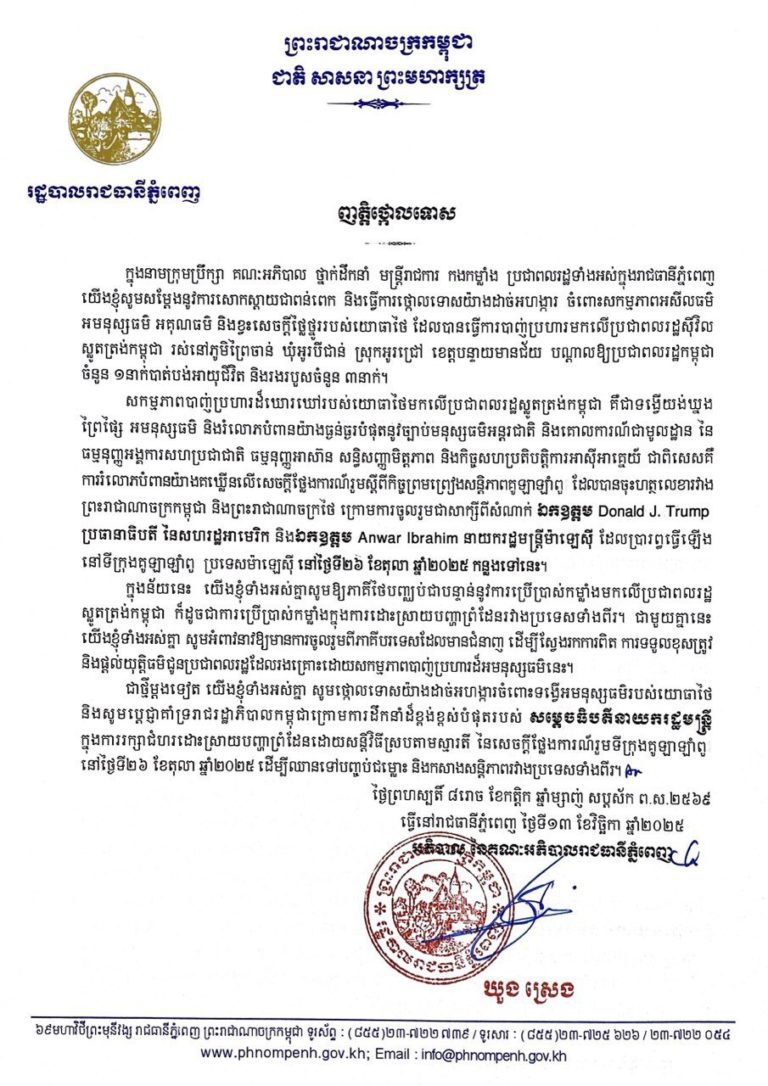 (ភ្នំពេញ)៖ អភិបាលរាជធានីភ្នំពេញ និងប្រជាពលរដ្ឋទាំងអស់ ប្រកាសថ្កោលទោស ដែលទាហានថៃ បាញ់ប្រហារបណ្តាលឱ្យពលរដ្ឋខ្មែរស្លាប់ និងរបួសនៅភូមិព្រៃចាន់ ឃុំអូរបីជាន់ ស្រុកអូរជ្រៅ ខេត្តបន្ទាយមានជ័យ។ នេះបើតាមញត្តិថ្កោលទោស របស់រដ្ឋបាលរាជធានីភ្នំពេញ ដែលបណ្ដាញព័ត៌មាន ទទួលបាននៅថ្ងៃទី១៣ ខែវិច្ឆិកា ឆ្នាំ២០២៥។