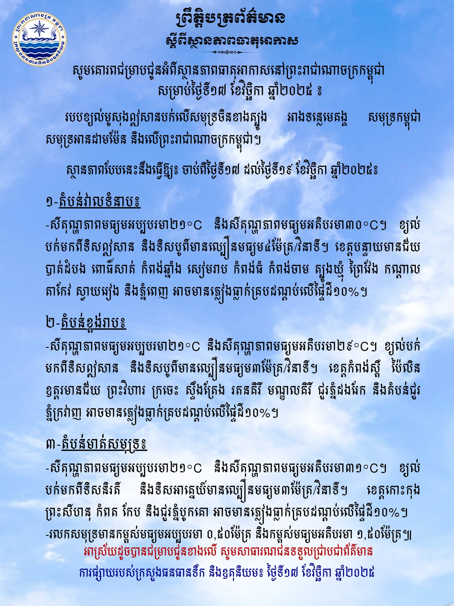 ក្រសួងធនធានទឹក ជូនដំណឹងអំពីស្ថានភាពធាតុអាកាសនៅកម្ពុជា សម្រាប់ថ្ងៃទី១៧ ខែវិច្ឆិកា ឆ្នាំ២០២៥