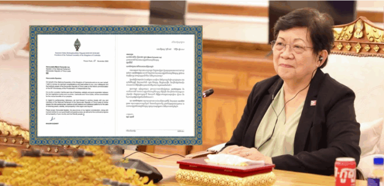 (ភ្នំពេញ)៖ សម្តេចមហារដ្ឋសភាធិការធិបតី ឃួន សុដារី ប្រធានរដ្ឋសភា នៃព្រះរាជាណាចក្រកម្ពុជា ផ្ញើសារលិខិតអបអរសាទរ គោរពជូនលោកជំទាវ ម៉ារីយ៉ា ហ្វឺណាន់ដា ឡាយ (Maria Fernanda Lay) ប្រធានសភាជាតិ នៃសាធារណរដ្ឋប្រជាធិបតេយ្យទីម័រឡេស្តេ ព្រមទាំងសហការី និងប្រជាជន នៃសាធារណរដ្ឋប្រជាធិបតេយ្យទីម័រឡេស្តេ ក្នុងឱកាសជាប្រវត្តិសាស្ត្រ នៃការប្រារព្ធខួបលើកទី៥០ នៃទិវាប្រកាសឯករាជ្យ។