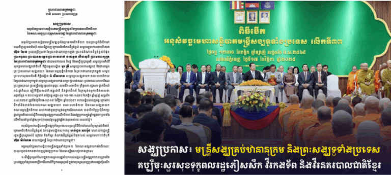 អង្គអនុសំវច្ឆរមហាសន្និបាតមន្ត្រីសង្ឃទូទាំងប្រទេស នៃគណៈសង្ឃនាយកទាំងពីរគណៈ បានសម្រេចឯកភាពដាក់ចេញនូវសង្ឃប្រកាស ដែលមានខ្លឹមសារដូចខាងក្រោម៖
