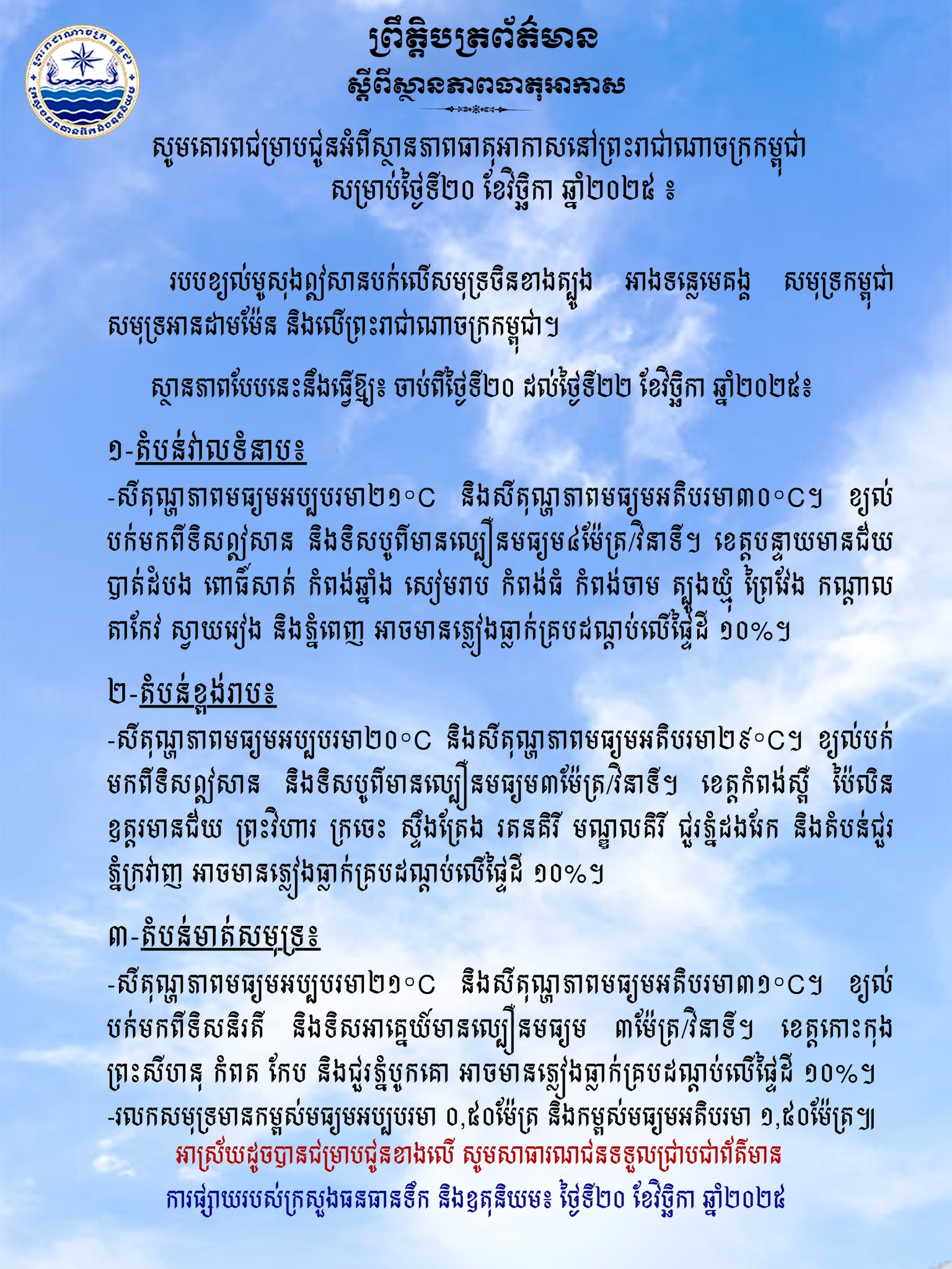 (ភ្នំពេញ)៖ ក្រសួងធនធានទឹក និងឧតុនិយម បានចេញសេចក្តីជូនដំណឹង អំពីស្ថានភាពធាតុអាកាសនៅកម្ពុជា សម្រាប់ថ្ងៃទី២០ ខែវិច្ឆិកា ឆ្នាំ២០២៥។