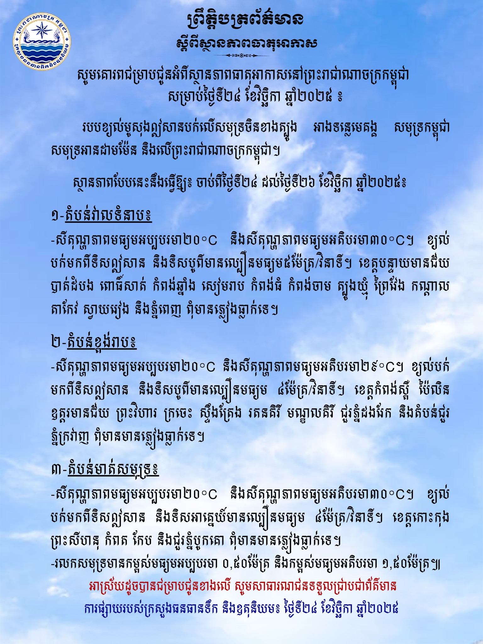 ក្រសួងធនធានទឹក ជូនដំណឹងអំពីស្ថានភាពធាតុអាកាសនៅកម្ពុជា សម្រាប់ថ្ងៃទី២៤ ខែវិច្ឆិកា ឆ្នាំ២០២៥