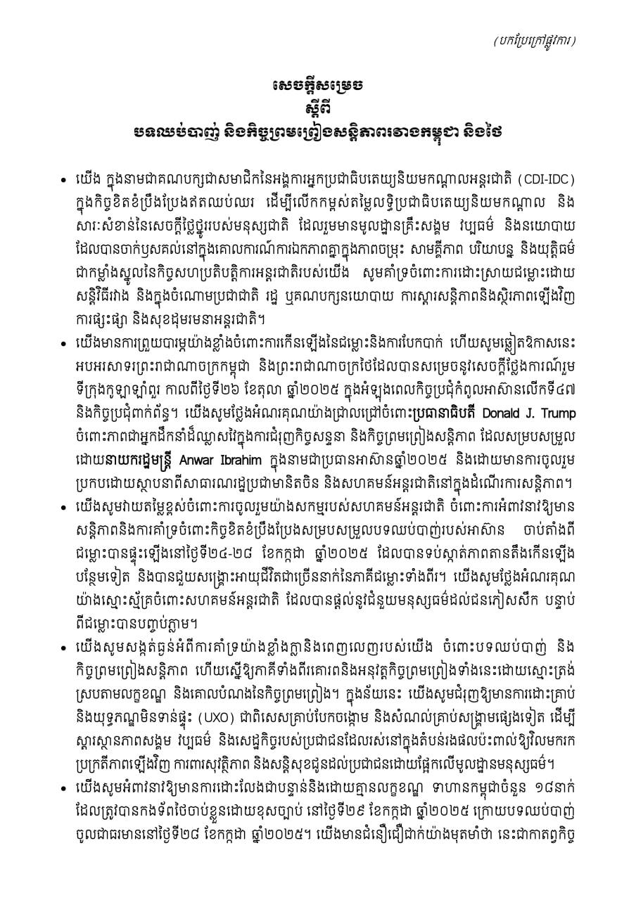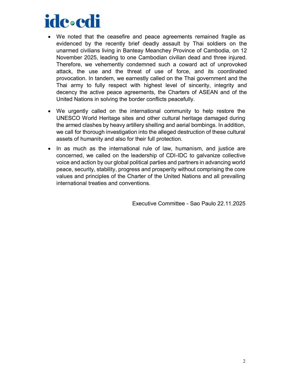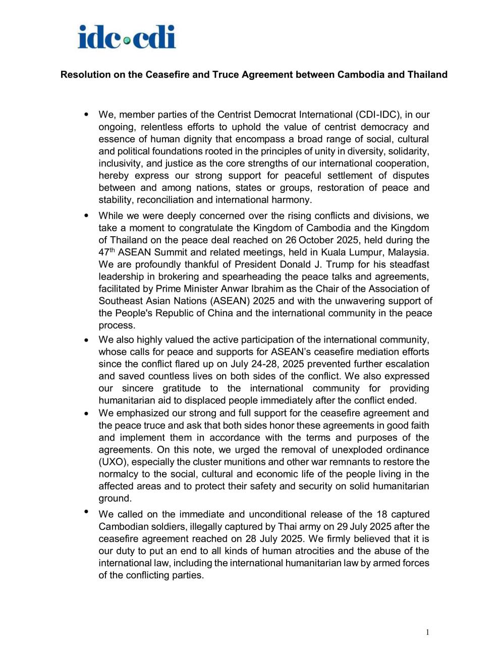អង្គការអ្នកប្រជាធិបតេយ្យនិយមកណ្តាលអន្តរជាតិគាំទ្រការដោះស្រាយជម្លោះដោយសន្តិវិធី, អំពាវនាវដោយស្មោះដល់រដ្ឋាភិបាលថៃនិងទាហានថៃគោរពនូវកិច្ចព្រមព្រៀងសន្តិភាព ធម្មនុញ្ញអាស៊ាន ធម្មនុញ្ញអសបក្នុងការដោះស្រាយជម្លោះព្រំដែនដោយសន្តិវិធី Posted on ថ្ងៃចន្ទ, 24 ខែវិច្ឆិកា, 2025ថ្ងៃចន្ទ, 24 ខែវិច្ឆិកា, 2025 អត្ថបទដោយ MET KIM AU
