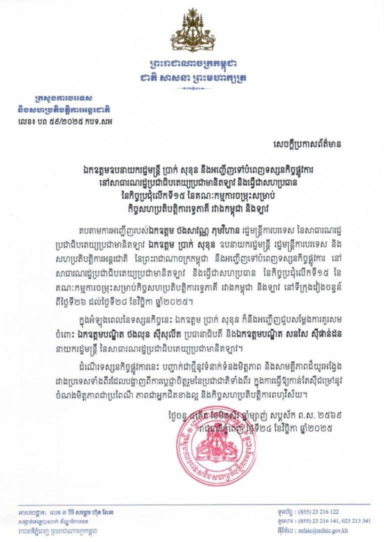 តបតាមការអញ្ជើញរបស់លោក ថងសាវណ្ណ កុមវិហាន រដ្ឋមន្ត្រីការបរទេស នៃសាធារណរដ្ឋប្រជាធិបតេយ្យប្រជាមានិតឡាវ, ឯកឧត្តមឧបនាយករដ្ឋមន្ត្រី ប្រាក់ សុខុន រដ្ឋមន្ត្រីការបរទេស និងសហប្រតិបត្តិការអន្តរជាតិ នៃព្រះរាជាណាចក្រកម្ពុជា នឹងអញ្ជើញទៅបំពេញទស្សនកិច្ចផ្លូវការ នៅប្រទេសឡាវ និងធ្វើជាសហប្រធាននៃកិច្ចប្រជុំលើកទី១៥ នៃគណៈកម្មការចម្រុះសម្រាប់កិច្ចសហប្រតិបត្តិការទ្វេភាគីរវាងកម្ពុជា និងឡាវ នៅទីក្រុងវៀងចន្ទន៍ ពីថ្ងៃទី២៦ ដល់ថ្ងៃទី២៨ ខែវិច្ឆិកា ឆ្នាំ២០២៥។