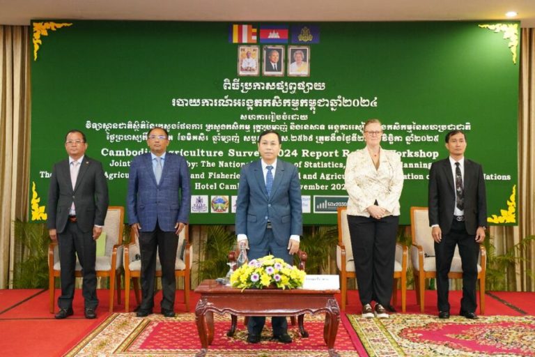 (រាជធានីភ្នំពេញ)៖ នាព្រឹកថ្ងៃទី២៧ ខែវិច្ឆិកា ឆ្នាំ២០២៥ នៅសណ្ឋាគារកាំបូឌីយ៉ាណា ឯកឧត្តម ប៊ិន ត្រឈៃ រដ្ឋមន្ត្រីក្រសួងផែនការ អញ្ជើញជាអធិបតីភាពដ៏ខ្ពង់ខ្ពស់ក្នុងពិធីប្រកាសផ្សព្វផ្សាយរបាយការណ៍អង្កេតកសិកម្មកម្ពុជាឆ្នាំ២០២៤ ដោយមានការអញ្ជើញចូលរួមពីឯកឧត្តម រិន វីរៈ រដ្ឋលេខាធិការក្រសួងផែនការ និងជាប្រធានក្រុមប្រឹក្សាភិបាលវិទ្យាស្ថានជាតិស្ថិតិ លោកស្រី Rebekah Bell នាយិកាអង្គការស្បៀង និងកសិកម្មនៃសហប្រជាជាតិ (FAO) ប្រចាំកម្ពុជា ឯកឧត្តម លោកជំទាវ លោក លោកស្រី តំណាងក្រសួង ស្ថាប័ន ដៃគូអភិវឌ្ឍ ភ្ញៀវជាតិ និងអន្តរជាតិ អញ្ជើញចូលរួម។