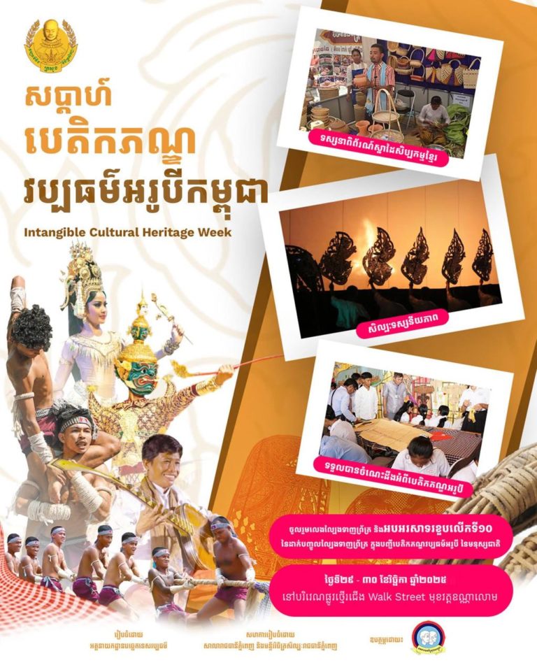 ក្រសួងវប្បធម៌និងវិចិត្រសិល្បៈ បានជូនដំណឹងពីកម្មវិធីលម្អិតនៃ «សប្ដាហ៍បេតិកភណ្ឌវប្បធម៌អរូបីកម្ពុជា» លើកទី១ ឆ្នាំ២០២៥ ដែលរៀបចំនៅថ្ងៃទី២៩-៣០ ខែវិច្ឆិកា ឆ្នាំ២០២៥ នៅផ្លូវថ្មើរជើង។