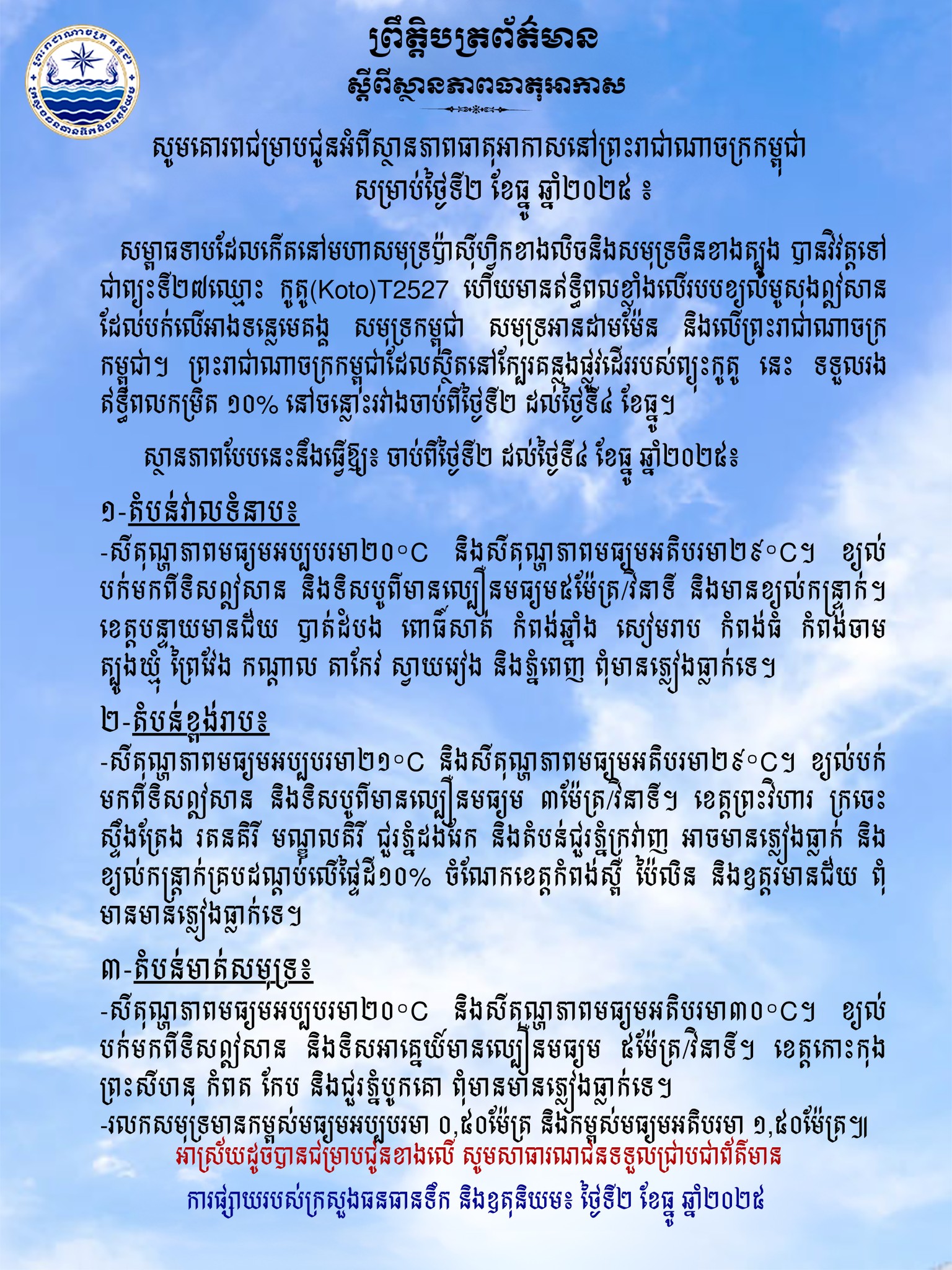 (ភ្នំពេញ)៖ ក្រសួងធនធានទឹក និងឧតុនិយម បានចេញសេចក្តីជូនដំណឹង អំពីស្ថានភាពធាតុអាកាសនៅកម្ពុជា សម្រាប់ថ្ងៃទី២ ខែធ្នូ ឆ្នាំ២០២៥។