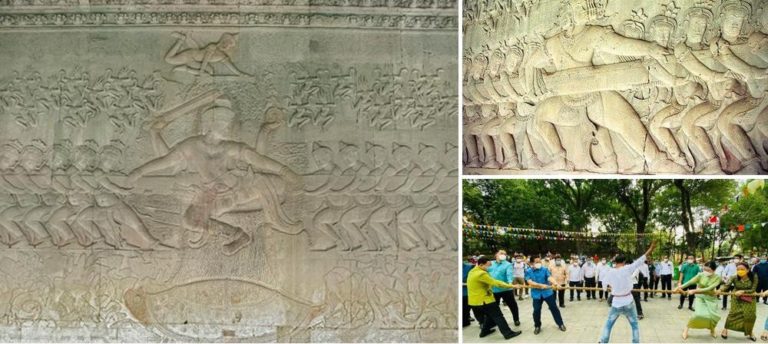 ល្បែងទាញព្រ័ត្របានផ្សារភ្ជាប់ ទៅនឹងប្រពៃណី និងវប្បធម៌ខ្មែរ ហើយយើងអាចឃើញភស្តុតាងមានតម្លៃជាប្រវត្តិសាស្ត្រ តាមរយៈចម្លាក់នៅលើប្រាង្គ ប្រាសាទនានា ដែលនិយាយពីរឿងកូរសមុទ្រទឹកដោះ៕