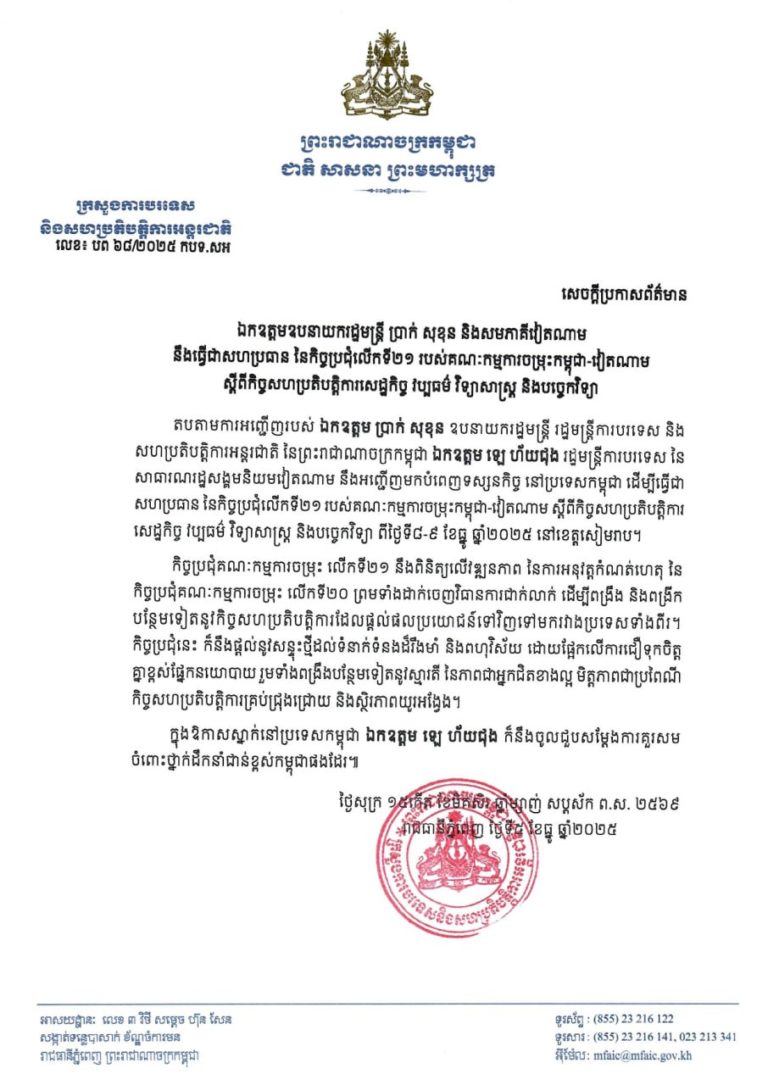តបតាមការអញ្ជើញរបស់ឧបនាយករដ្ឋមន្ត្រី ប្រាក់ សុខុន រដ្ឋមន្ត្រីការបរទេស និងសហប្រតិបត្តិការអន្តរជាតិនៃកម្ពុជា, លោក ឡេ ហើយជុង រដ្ឋមន្ត្រីការបរទេស នៃសាធារណរដ្ឋសង្គមនិយមវៀតណាម នឹងអញ្ជើញមកបំពេញទស្សនកិច្ចនៅប្រទេសកម្ពុជា ដើម្បីធ្វើជាសហប្រធាន នៃកិច្ចប្រជុំលើកទី២១របស់គណៈកម្មការចម្រុះកម្ពុជា-វៀតណាម ស្តីពីកិច្ចសហប្រតិបត្តិការ សេដ្ឋកិច្ច វប្បធម៌ វិទ្យាសាស្ត្រ និងបច្ចេកវិទ្យា ពីថ្ងៃទី៨-៩ ខែធ្នូ ឆ្នាំ២០២៥ នៅខេត្តសៀមរាប។