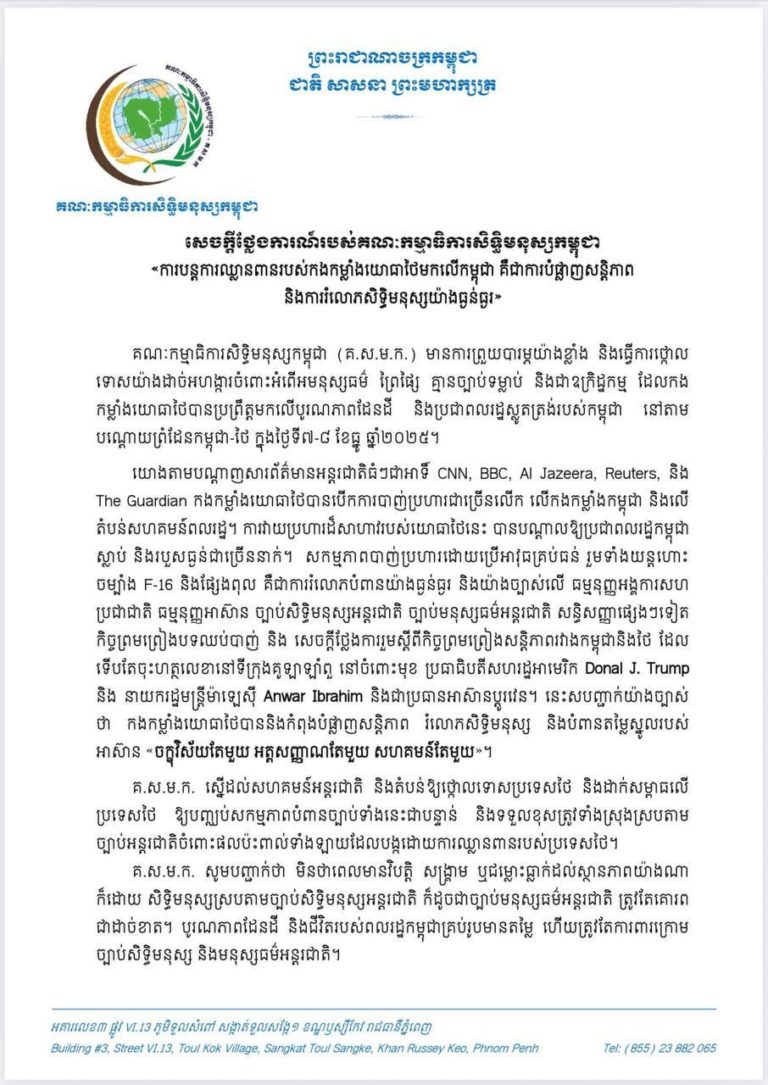គណៈកម្មាធិការសិទ្ធិមនុស្សកម្ពុជា មានការព្រួយបារម្ភយ៉ាងខ្លាំង និងធ្វើការថ្កោលទោសយ៉ាងដាច់អហង្ការ ចំពោះអំពើអមនុស្សធម៌ ព្រៃផ្សៃ គ្មានច្បាប់ទម្លាប់ និងជាឧក្រិដ្ឋកម្ម ដែលកងកម្លាំងយោធាថៃបានប្រព្រឹត្តមកលើបូរណភាពដែនដី និងប្រជាពលរដ្ឋស្លូតត្រង់របស់កម្ពុជា នៅតាមបណ្តោយព្រំដែនកម្ពុជា-ថៃ ក្នុងថ្ងៃទី៧-៨ ខែធ្នូ ឆ្នាំ២០២៥។