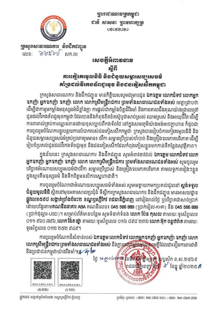 នៅក្នុងសេចក្តីអំពាវនាវនេះ បានបញ្ជាក់ទៀតថាក្រសួងសាធារណការ និងដឹកជញ្ជូន សូមអំពាវនាវដល់ ឯកឧត្តម លោកជំទាវ លោក អ្នកឧកញ៉ា អ្នកឧកញ៉ា ឧកញ៉ា លោក លោកស្រី មន្ត្រីរាជការ ព្រមទាំងសាធារណជនទាំងអស់ សូមចូលរួម បរិច្ចាគអំណោយសប្បុរសធម៌ជាថវិកា សម្ភារប្រើប្រាស់ និងគ្រឿងឧបភោគបរិភោគ តាមលទ្ធភាពរៀងៗខ្លួន ក្នុងស្មារតីមនុស្សធម៌ និងទឹកចិត្តមនសិការស្នេហាជាតិ។