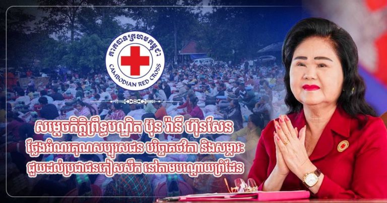 សម្តេចកិត្តិព្រឹទ្ធបណ្ឌិត ប៊ុន រ៉ានី ហ៊ុនសែន ប្រធានកាកបាទក្រហមកម្ពុជា សូមថ្លែងអំណរគុណយ៉ាងជ្រាលជ្រៅចំពោះ ឯកឧត្តម ជា សុផារ៉ា ឧត្តមប្រឹក្សាផ្ទាល់ព្រះមហាក្សត្រនៃព្រះរាជាណាចក្រកម្ពុជា និងលោកជំទាវ ដែលបានឧបត្ថម្ភថវិកាចំនួន ២០,០០០ ដុល្លារ (ពីរម៉ឺនដុល្លារអាម៉េរិក) ដល់កាកបាទក្រហមកម្ពុជា សម្រាប់ប្រតិបត្តិការជួយដល់ប្រជាជនភៀសសឹក នៅតាមបណ្តោយព្រំដែន៕