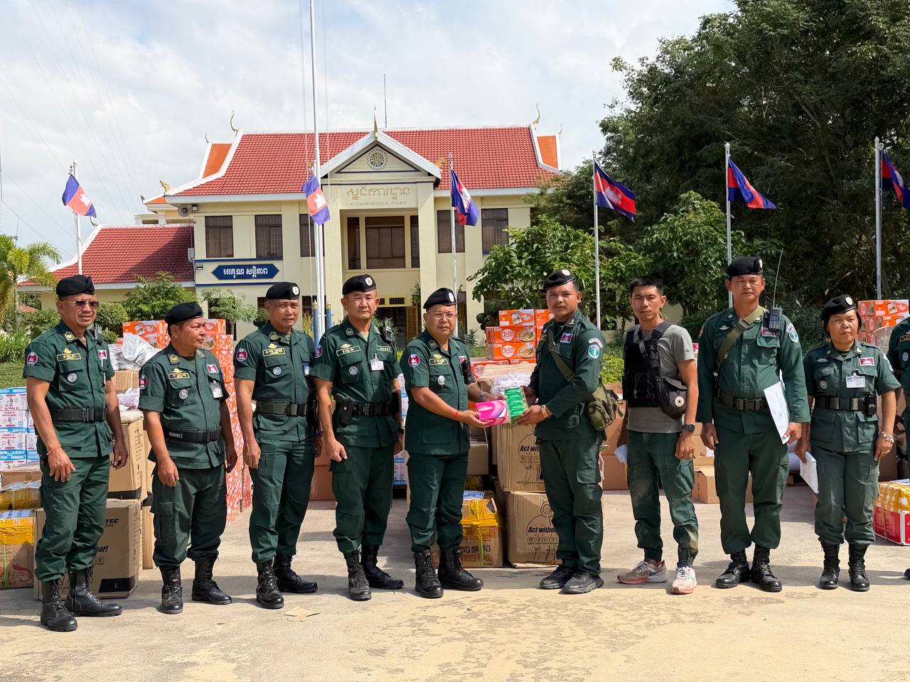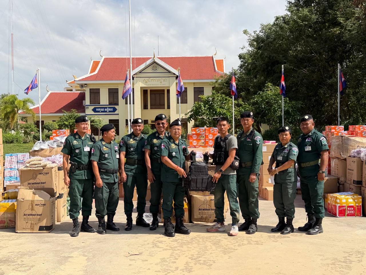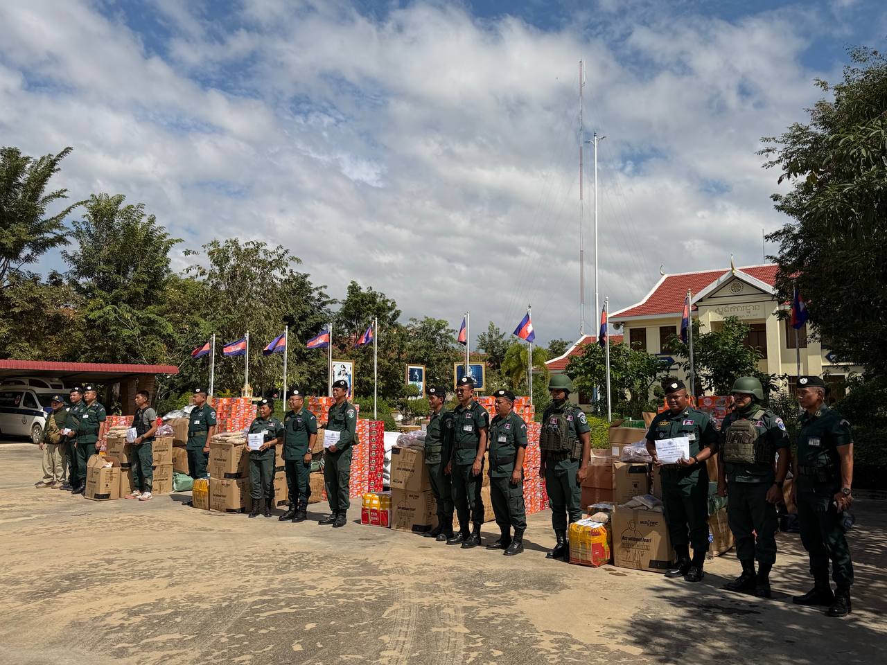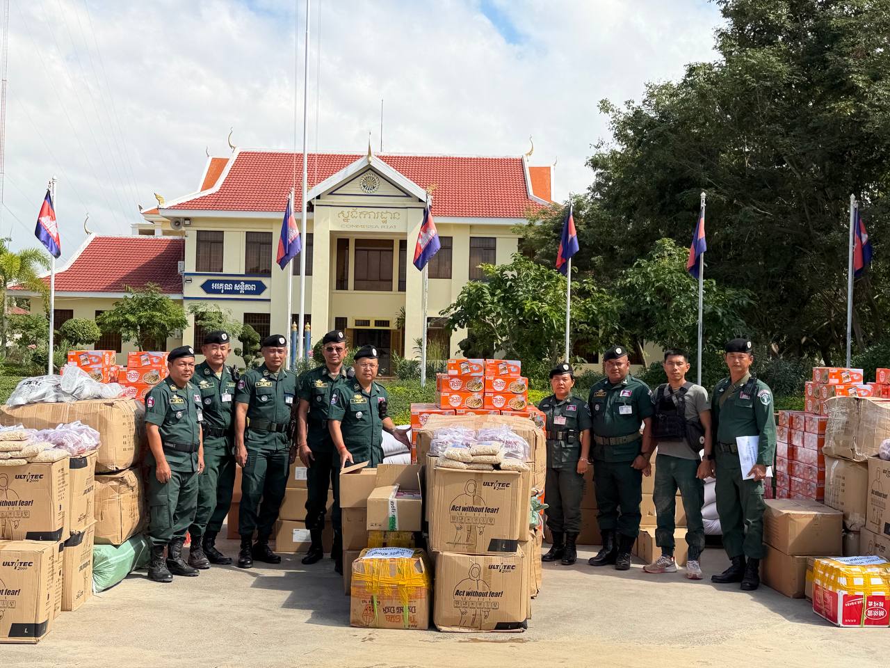 ស្បៀង ថ្នាំពេទ្យ និងសម្ភារៈប្រើប្រាស់ រួមមាន ទឹកក្រូចចំនួន ១៨០កេស, មីជាតិចំនួន ៤៥០កេសតូច, ត្រីខចំនួន ៤៥កេស, ត្រីងៀតចំនួន ១២៥គីឡូក្រាម, ត្រូវឆ្អើរចំនួន ១២៥គីឡូក្រាម, អង្ករចំនួន ៤១០០គីឡូក្រាម, ថ្នាំប៉ារ៉ាចំនួន ១០៥ប្រអប់, ថ្នាំរាគចំនួន ១០៥ប្រអប់, កាល់ស្យូម ចំនួន ៥៧៥ប្រអប់, បេរ៉ូកា ចំនួន ៥៧៥ប្រអប់, អាវការពារគ្រាប់ចំនួន ៤៥អាវ, អាវការពាររងារចំនួន២០០អាវ, ស្បែកជើងចំនួន ៥៧៥គូ និងអាវការពារគីមីចំនួន ១២៥០អាវ៕