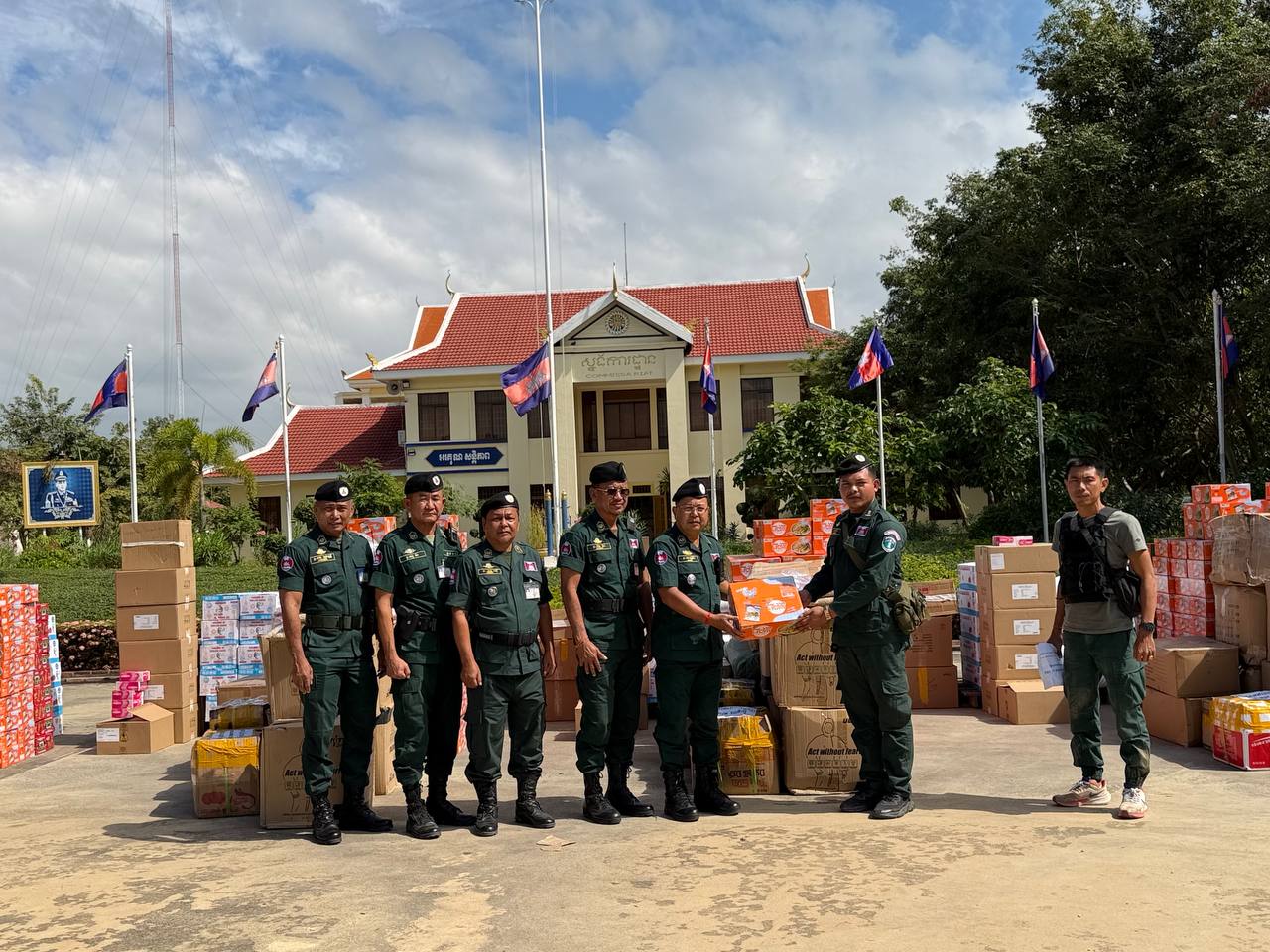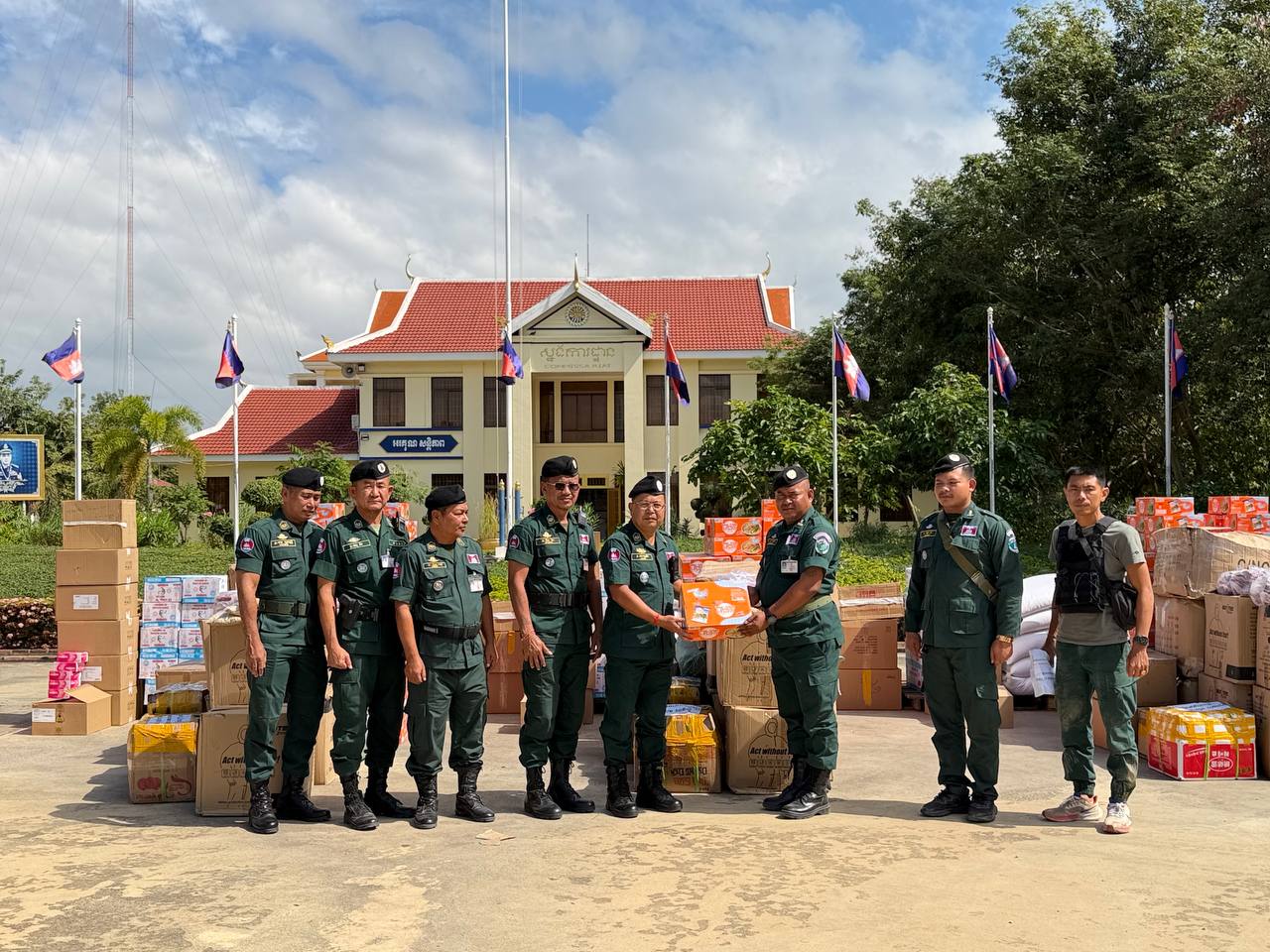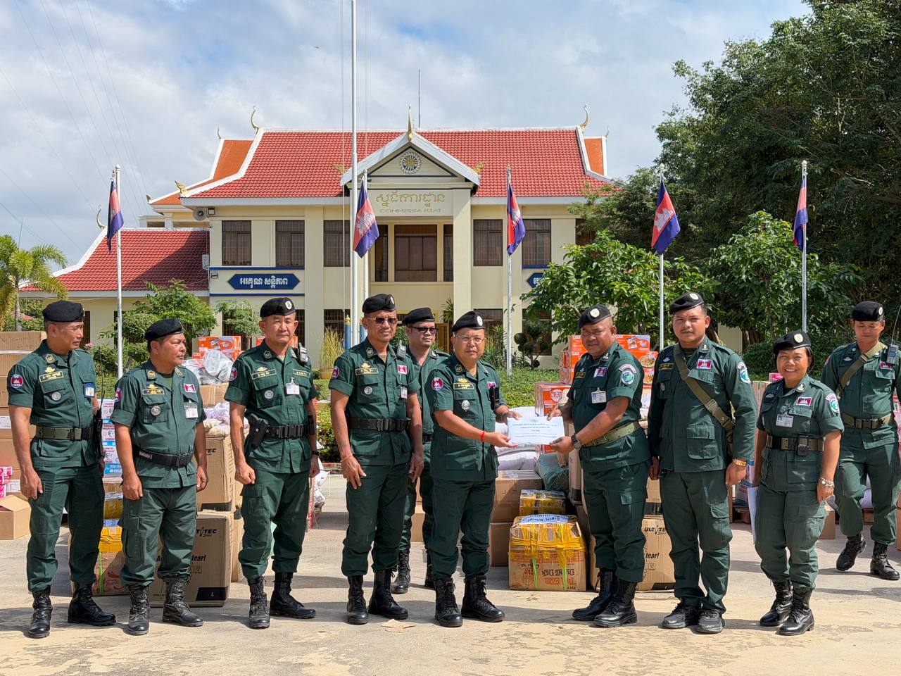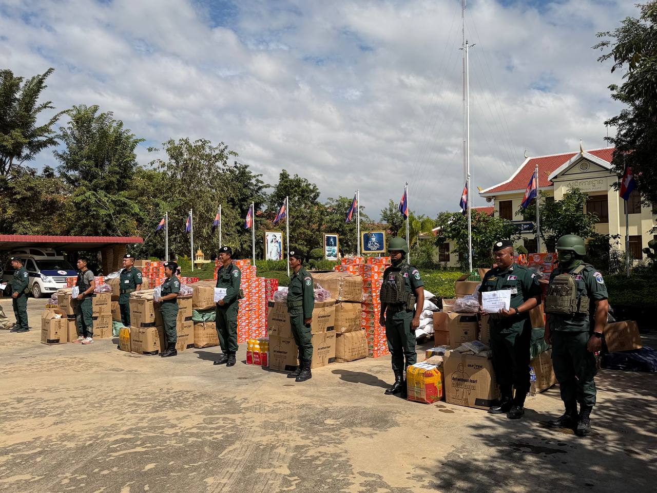 ស្បៀង ថ្នាំពេទ្យ និងសម្ភារៈប្រើប្រាស់ រួមមាន ទឹកក្រូចចំនួន ១៨០កេស, មីជាតិចំនួន ៤៥០កេសតូច, ត្រីខចំនួន ៤៥កេស, ត្រីងៀតចំនួន ១២៥គីឡូក្រាម, ត្រូវឆ្អើរចំនួន ១២៥គីឡូក្រាម, អង្ករចំនួន ៤១០០គីឡូក្រាម, ថ្នាំប៉ារ៉ាចំនួន ១០៥ប្រអប់, ថ្នាំរាគចំនួន ១០៥ប្រអប់, កាល់ស្យូម ចំនួន ៥៧៥ប្រអប់, បេរ៉ូកា ចំនួន ៥៧៥ប្រអប់, អាវការពារគ្រាប់ចំនួន ៤៥អាវ, អាវការពាររងារចំនួន២០០អាវ, ស្បែកជើងចំនួន ៥៧៥គូ និងអាវការពារគីមីចំនួន ១២៥០អាវ៕