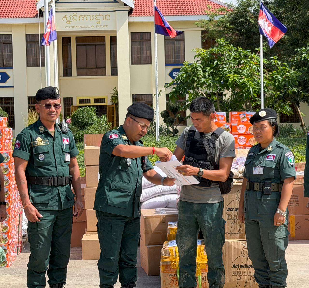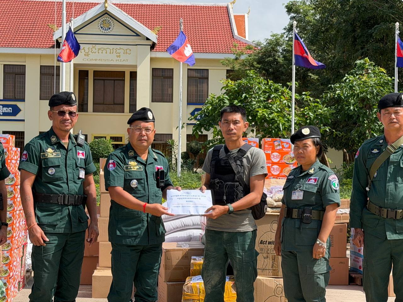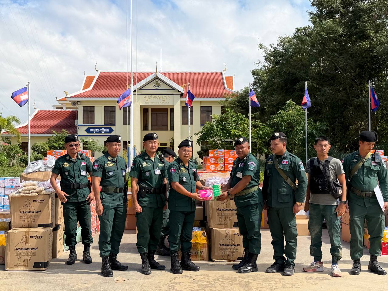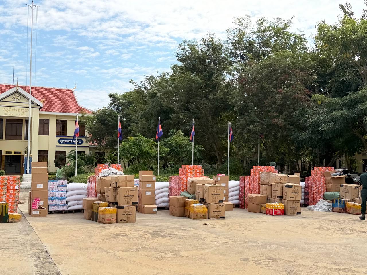 ស្បៀង ថ្នាំពេទ្យ និងសម្ភារៈប្រើប្រាស់ រួមមាន ទឹកក្រូចចំនួន ១៨០កេស, មីជាតិចំនួន ៤៥០កេសតូច, ត្រីខចំនួន ៤៥កេស, ត្រីងៀតចំនួន ១២៥គីឡូក្រាម, ត្រូវឆ្អើរចំនួន ១២៥គីឡូក្រាម, អង្ករចំនួន ៤១០០គីឡូក្រាម, ថ្នាំប៉ារ៉ាចំនួន ១០៥ប្រអប់, ថ្នាំរាគចំនួន ១០៥ប្រអប់, កាល់ស្យូម ចំនួន ៥៧៥ប្រអប់, បេរ៉ូកា ចំនួន ៥៧៥ប្រអប់, អាវការពារគ្រាប់ចំនួន ៤៥អាវ, អាវការពាររងារចំនួន២០០អាវ, ស្បែកជើងចំនួន ៥៧៥គូ និងអាវការពារគីមីចំនួន ១២៥០អាវ៕