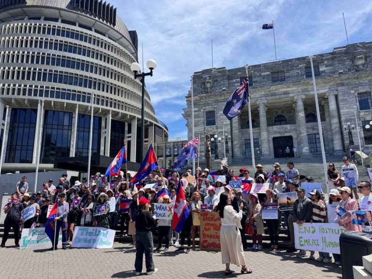 រសៀលថ្ងៃអាទិត្យ ទី១៤ ខែធ្នូ ឆ្នាំ២០២៥ ប្រជាពលរដ្ឋខ្មែររស់នៅក្នុងរដ្ឋធានីវ៉ែល្លីងតុន ទីក្រុងក្រៃឈើច ទីក្រុងផាមើស្តុនណតស៍ ប្រទេសនូវ៉ែលហ្សេឡង់ ប្រមាណជាង ៤០០នាក់ បានជួបជុំគ្នានៅមុខរដ្ឋសភារដ្ឋធានីវ៉ែល្លីងតុន ប្រទេសនូវ៉ែលហ្សេឡង់ ដើម្បី៖