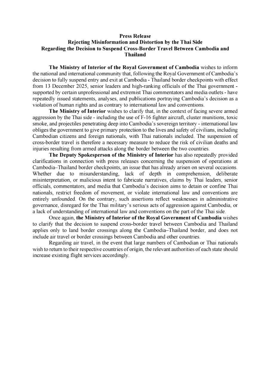 ក្រសួងមហាផ្ទៃ នៃរាជរដ្ឋាភិបាលកម្ពុជា ចេញសេចក្ដីប្រកាសច្រានចោលការបំភាន់ និងមួលបង្កាច់របស់ភាគីថៃ លើការសម្រេចផ្អាកការធ្វើដំណើរឆ្លងកាត់ព្រំដែនកម្ពុជាជាប់ជាមួយថៃ។
