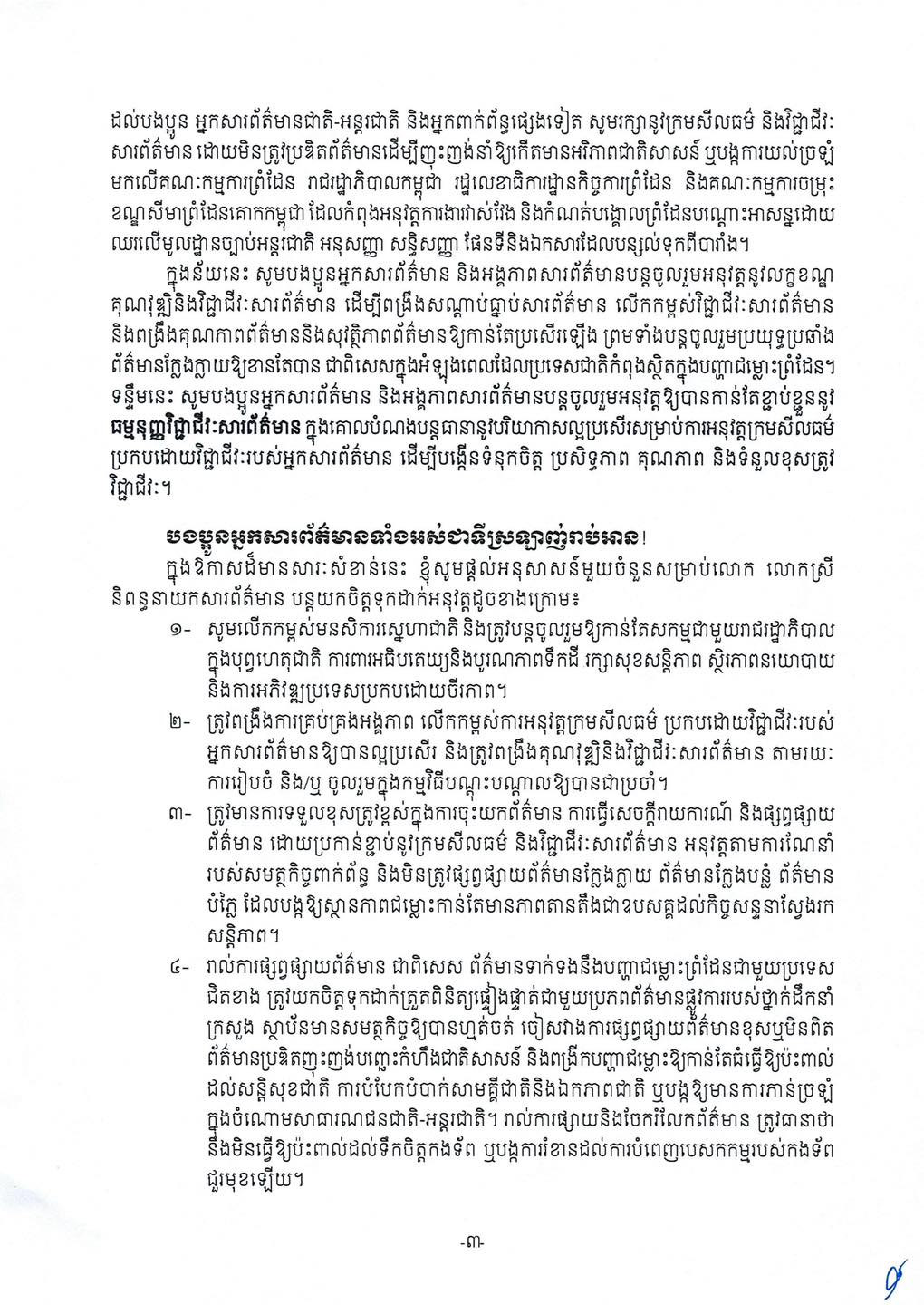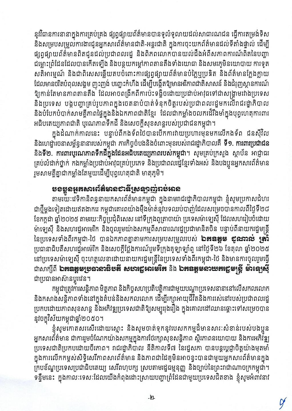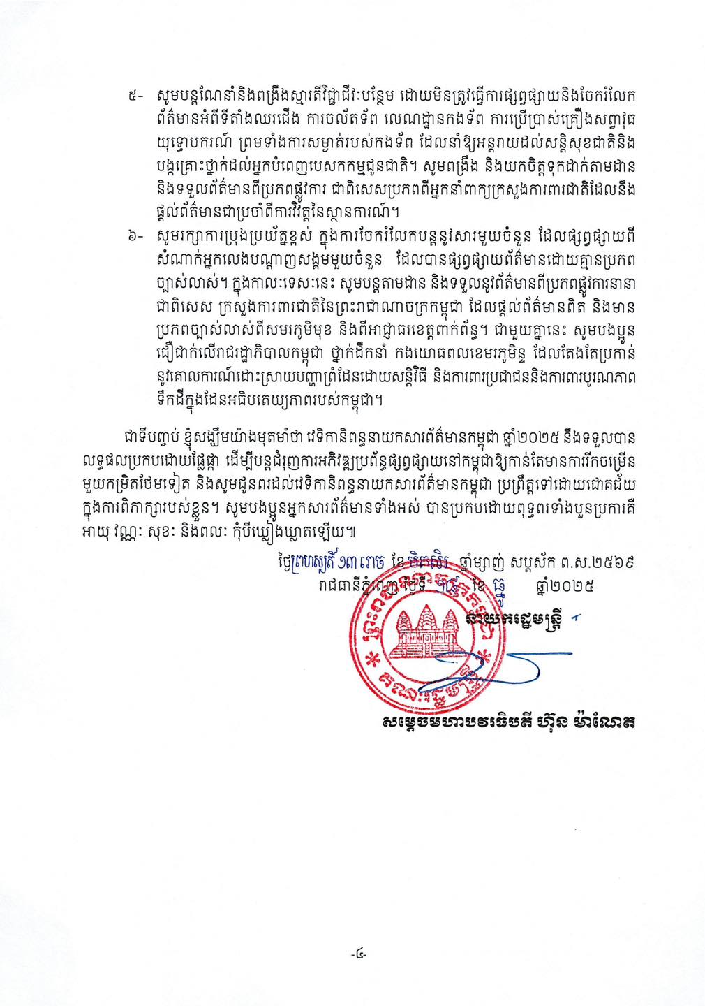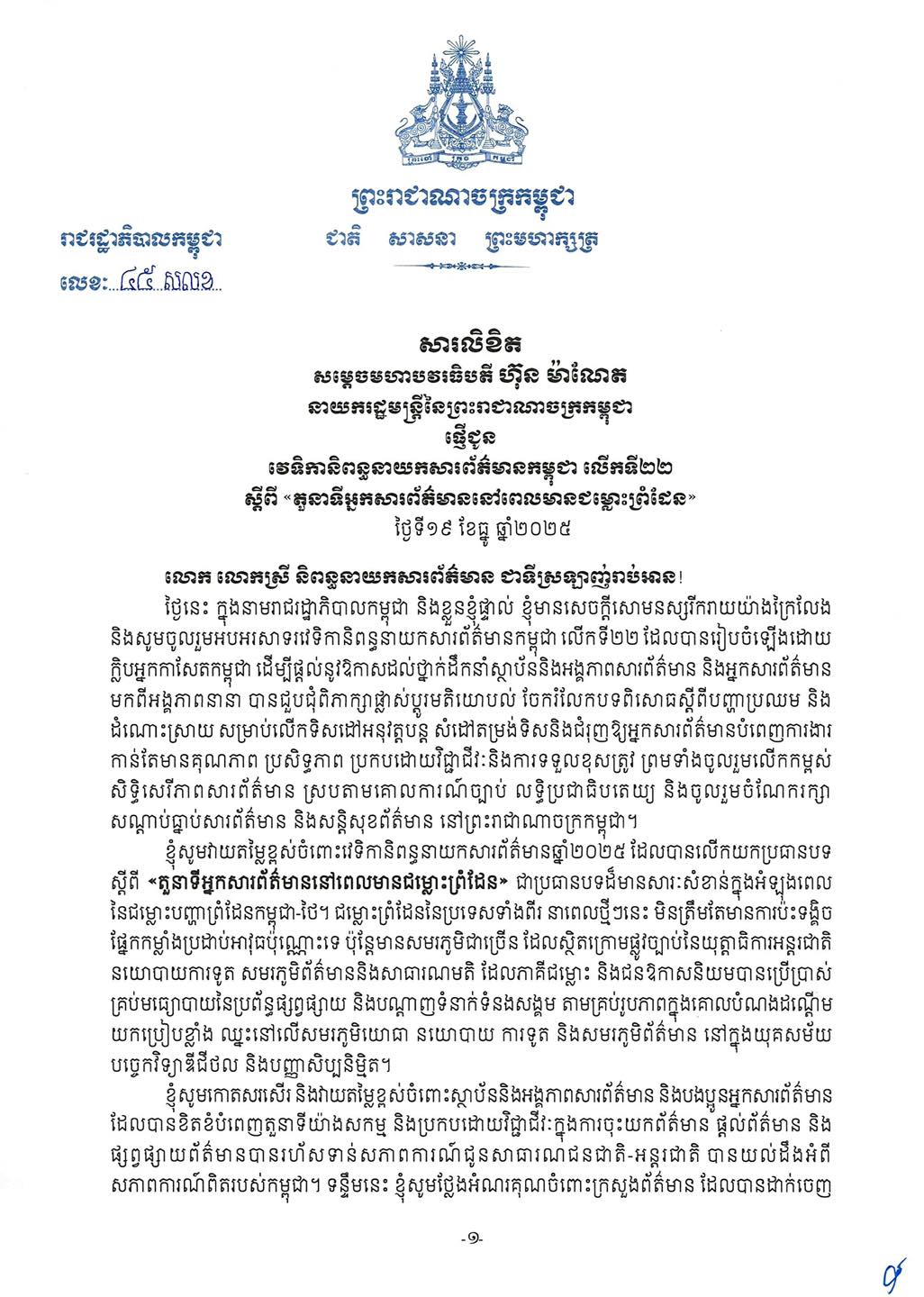 សម្តេចមហាបវរធិបតី ហ៊ុន ម៉ាណែត នាយករដ្ឋមន្ត្រីនៃកម្ពុជា បានចេញសារលិខិត ផ្ញើជូនវេទិកានិពន្ធនាយកសារព័ត៌មានកម្ពុជា លើកទី២២ ស្តីពី «តួនាទីអ្នកសារព័ត៌មាន នៅពេលមានជម្លោះព្រំដែន» ថ្ងៃទី១៩ ខែធ្នូ ឆ្នាំ២០២៥។