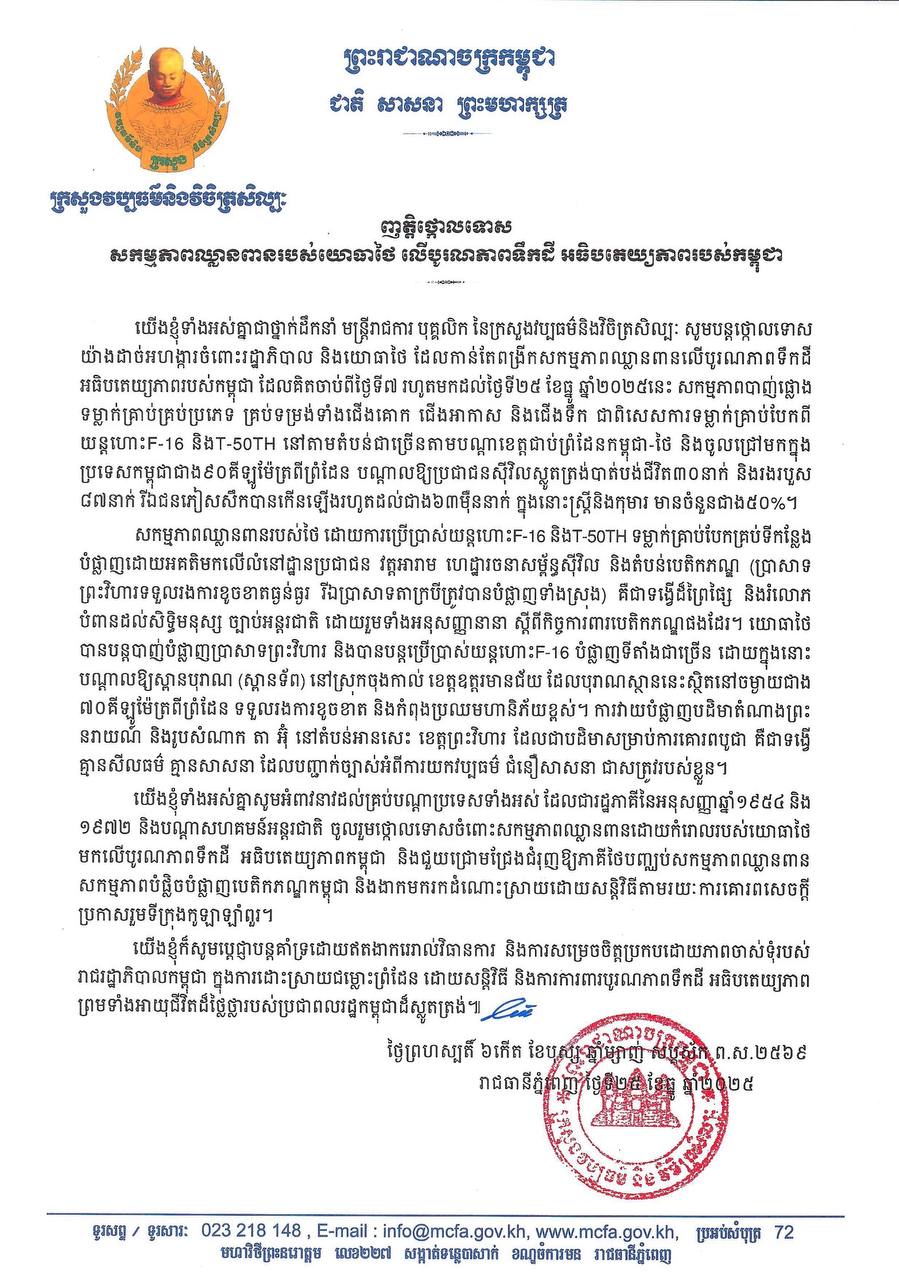 យើងខ្ញុំទាំងអស់គ្នាជាថ្នាក់ដឹកនាំ មន្ត្រីរាជការ បុគ្គលិក នៃក្រសួងវប្បធម៌និងវិចិត្រសិល្បៈ សូមបន្តថ្កោលទោសយ៉ាងដាច់អហង្ការចំពោះរដ្ឋាភិបាល និងយោធាថៃ ដែលកាន់តែពង្រីកសកម្មភាពឈ្លានពានលើបូរណភាពទឹកដី អធិបតេយ្យភាពរបស់កម្ពុជា ដែលគិតចាប់ពីថ្ងៃទី៧ រហូតមកដល់ថ្ងៃទី២៥ ខែធ្នូ ឆ្នាំ២០២៥នេះ សកម្មភាពបាញ់ផ្លោង ទម្លាក់គ្រាប់គ្រប់ប្រភេទ គ្រប់ទម្រង់ទាំងជើងគោក ជើងអាកាស និងជើងទឹក ជាពិសេសការទម្លាក់គ្រាប់បែកពីយន្តហោះF-16 និងT-50TH នៅតាមតំបន់ជាច្រើនតាមបណ្ដាខេត្តជាប់ព្រំដែនកម្ពុជា-ថៃ និងចូលជ្រៅមកក្នុងប្រទេសកម្ពុជាជាង៩០គីឡូម៉ែត្រពីព្រំដែន បណ្តាលឱ្យប្រជាជនស៊ីវិលស្លូតត្រង់បាត់បង់ជីវិត៣០នាក់ និងរងរបួស៨៧នាក់ រីឯជនភៀសសឹកបានកើនឡើងរហូតដល់ជាង៦៣ម៉ឺននាក់ ក្នុងនោះស្ត្រីនិងកុមារ មានចំនួនជាង៥០%។