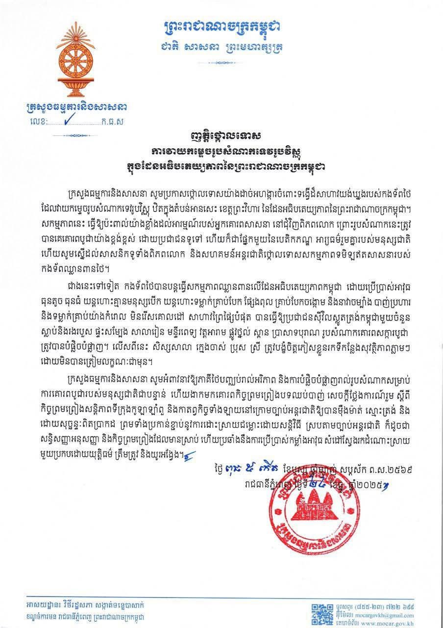 ក្រសួងធម្មការ និងសាសនា សូមប្រកាសថ្កោលទោសយ៉ាងដាច់អហង្ការចំពោះទង្វើដ៏សាហាវយង់ឃ្នងរបស់កងទ័ព ដែលវាយកម្ទេចរូបសំណាកទេវរូបវិស្ណុ ឋិតក្នុងតំបន់អានសេះ ខេត្តព្រះវិហារ នៃដែនអធិបតេយ្យភាពនៃព្រះរាជាណាចក្រកម្ពុជា។
