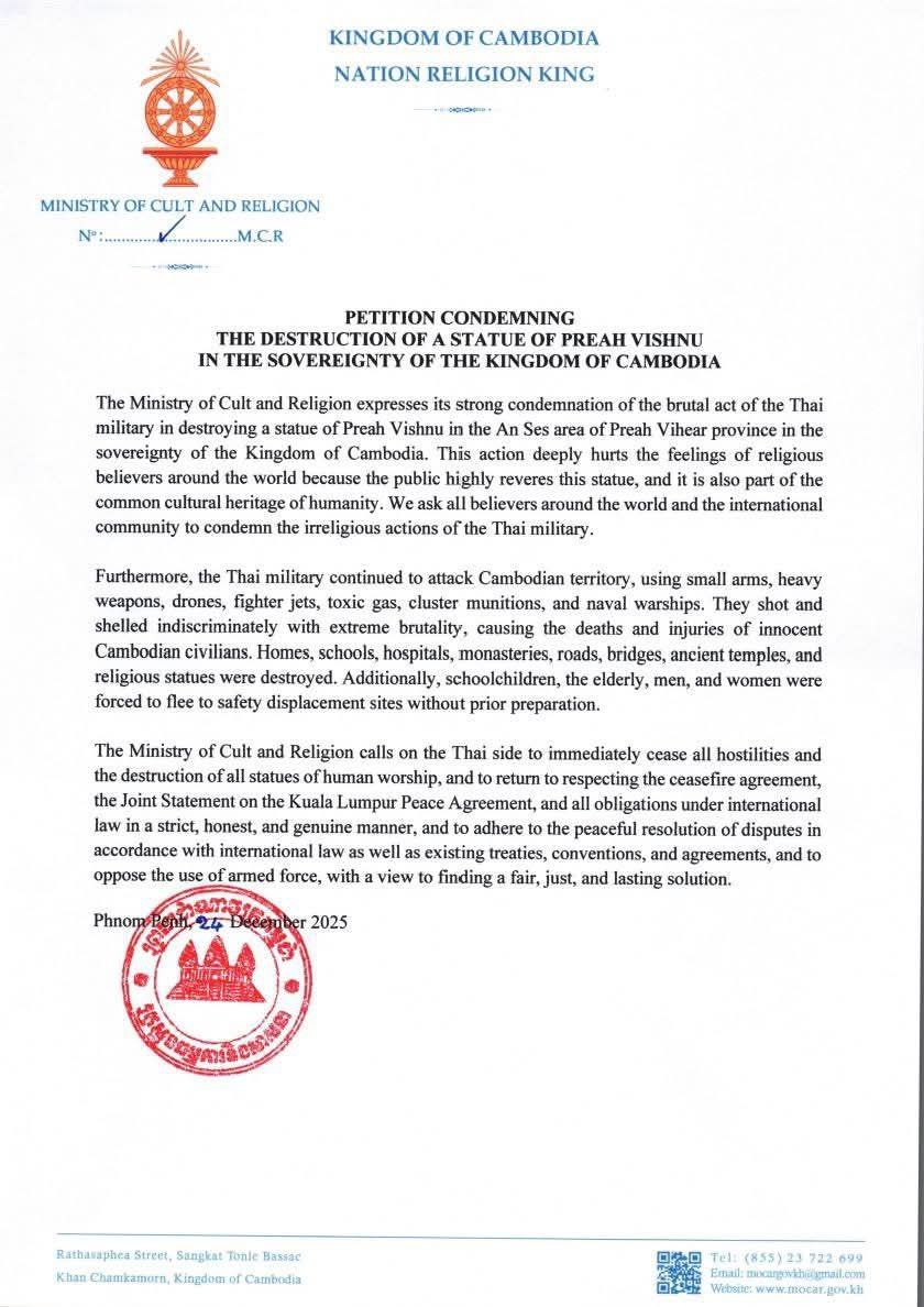 The Ministry of Cult and Religion called on the Thai side to immediately cease all hostilities and the destruction of all statues of human worship, and to return to respecting the ceasefire agreement, the Joint Statement on the Kuala Lumpur Peace Agreement, and all obligations under international law in a strict, honest, and genuine manner, and to adhere to the peaceful resolution of disputes in accordance with international law as well as existing treaties, conventions, and agreements, and to oppose the use of armed force, with a view to finding a fair, just, and lasting solution.