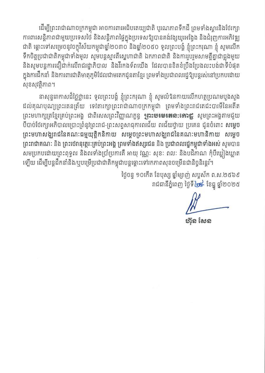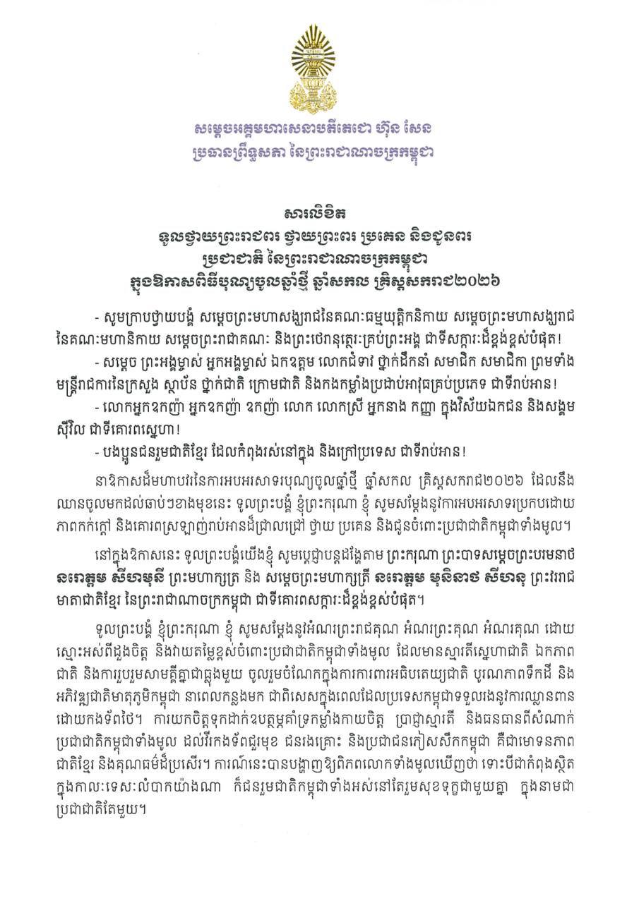 សារលិខិតជូនពរ សម្តេចអគ្គមហាសេនាបតីតេជោ ហ៊ុន សែន ប្រធានព្រឹទ្ធសភានៃព្រះរាជាណាចក្រកម្ពុជា និងជាប្រធានក្រុមឧត្តមប្រឹក្សាផ្ទាល់ព្រះមហាក្សត្រ នៃព្រះរាជាណាចក្រកម្ពុជា សូមទូលថ្វាយព្រះរាជពរ សម្តេចព្រះមហាសង្ឃរាជទាំងពីរគណៈ ថ្វាយសម្តេចព្រះរាជាគណៈ ថ្វាយព្រះពរសម្តេច ព្រះអង្គម្ចាស់ អ្នកអង្គម្ចាស់ ប្រគេនពរព្រះថេរានុត្ថេរៈគ្រប់ព្រះអង្គ និងជូនពរឯកឧត្តម លោកជំទាវ ថ្នាក់ដឹកនាំ មន្ត្រីរាជការ កងកម្លាំងប្រដាប់អាវុធគ្រប់ប្រភេទ លោកអ្នកឧកញ៉ា អ្នកឧកញ៉ា ឧកញ៉ា បងបងប្អូនជនរួមជាតិ នៃព្រះរាជាណាចក្រកម្ពុជា ក្នុងឱកាសពិធីបុណ្យចូលឆ្នាំថ្មី ឆ្នាំសាកល គ្រិស្តសករាជ២០២៦ Posted on ថ្ងៃព្រហស្បតិ៍, 1 ខែមករា, 2026ថ្ងៃព្រហស្បតិ៍, 1 ខែមករា, 2026 អត្ថបទដោយ Sovann
