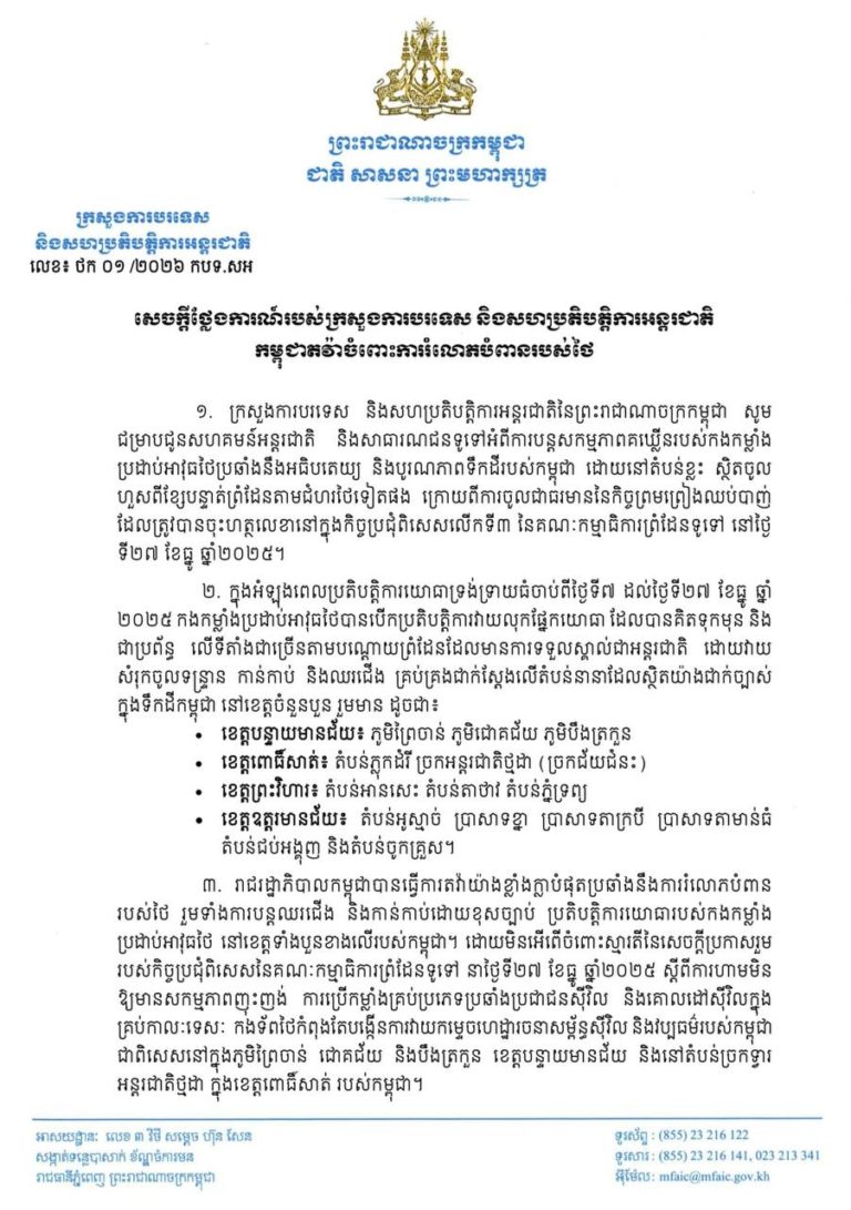 រាជរដ្ឋាភិបាលកម្ពុជាបានធ្វើការតវ៉ាយ៉ាងខ្លាំងក្លាបំផុតប្រឆាំងនឹងការរំលោភបំពាន របស់ថៃ រួមទាំងការបន្តឈរជើង និងកាន់កាប់ដោយខុសច្បាប់ ប្រតិបត្តិការយោធារបស់កងកម្លាំងប្រដាប់អាវុធថៃ នៅខេត្តទាំងបួនខាងលើរបស់កម្ពុជា។ ដោយមិនអើពើចំពោះស្មារតីនៃសេចក្តីប្រកាសរួមរបស់កិច្ចប្រជុំពិសេសនៃគណៈកម្មាធិការព្រំដែនទូទៅ នាថ្ងៃទី២៧ ខែធ្នូ ឆ្នាំ២០២៥ ស្តីពីការហាមមិនឱ្យមានសកម្មភាពញុះញង់ ការប្រើកម្លាំងគ្រប់ប្រភេទប្រឆាំងប្រជាជនស៊ីវិល និងគោលដៅស៊ីវិលក្នុងគ្រប់កាលៈទេសៈ កងទ័ពថៃកំពុងតែបង្កើនការវាយកម្ទេចហេដ្ឋារចនាសម្ព័ន្ធស៊ីវិល និងវប្បធម៌របស់កម្ពុជា ជាពិសេសនៅក្នុងភូមិព្រៃចាន់ ជោគជ័យ និងបឹងត្រកួន ខេត្តបន្ទាយមានជ័យ និងនៅតំបន់ច្រកទ្វារអន្តរជាតិថ្មដា ក្នុងខេត្តពោធិ៍សាត់ របស់កម្ពុជា។