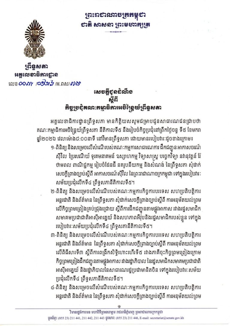 ព្រឹទ្ធសភាកម្ពុជា នឹងបើកកិច្ចប្រជុំគណៈកម្មាធិការអចិន្ត្រៃយ៍ នៅព្រឹកថ្ងៃទី០៥ ខែមករា ឆ្នាំ២០២៦ ស្អែកនេះ ដល់មានរបៀបវារៈចំនួន ៦។