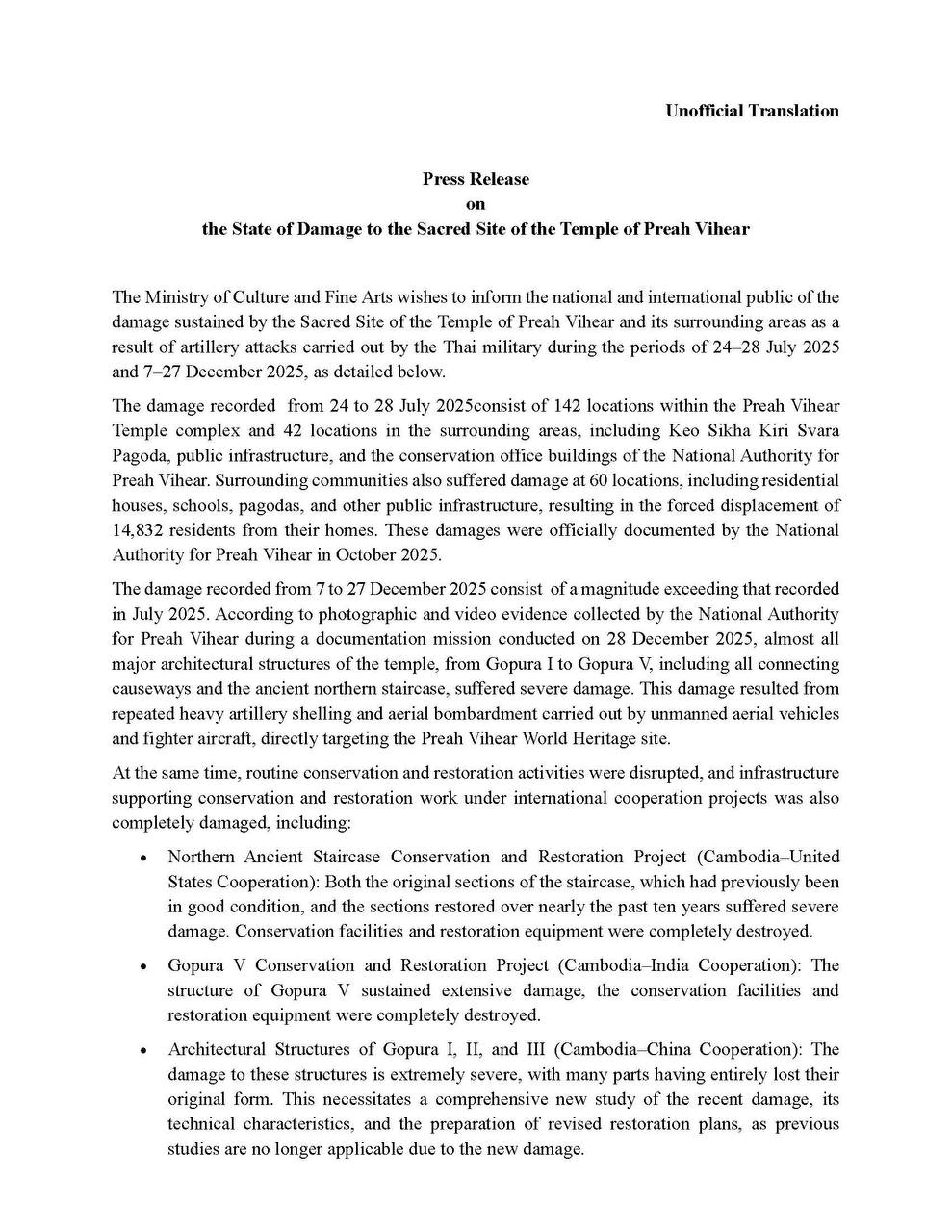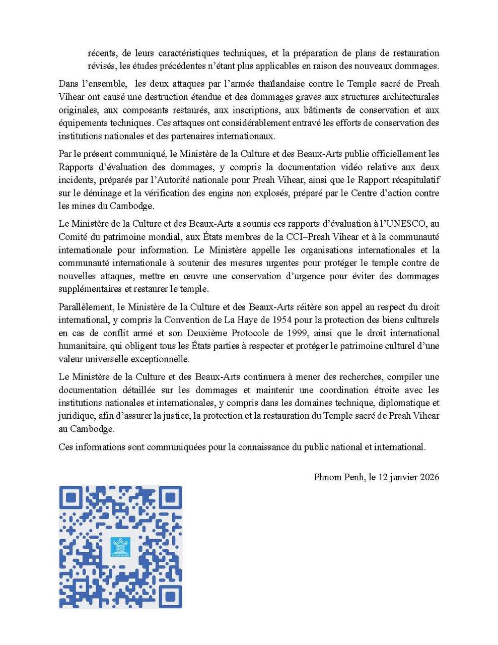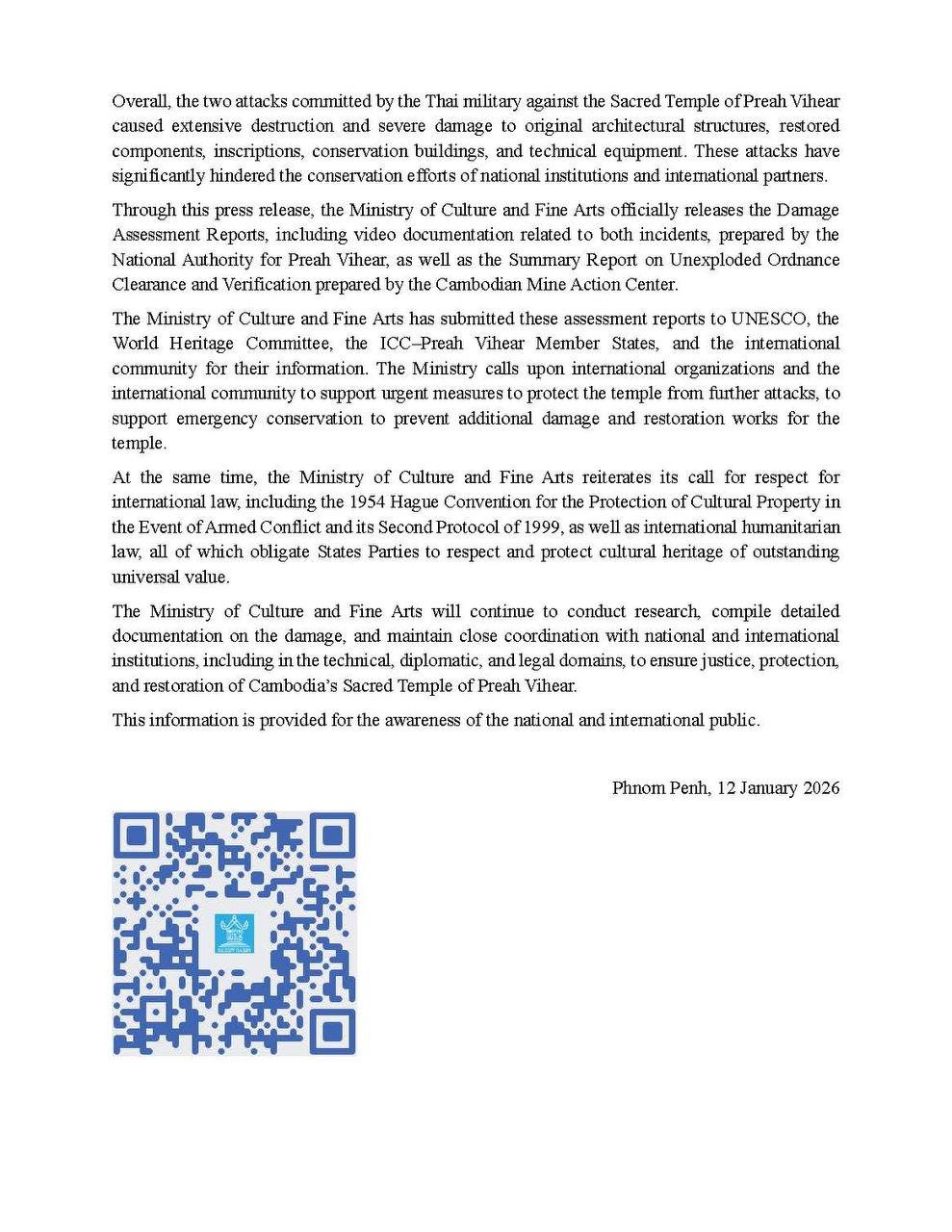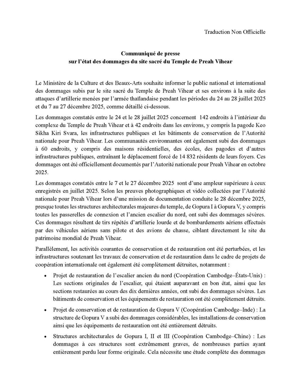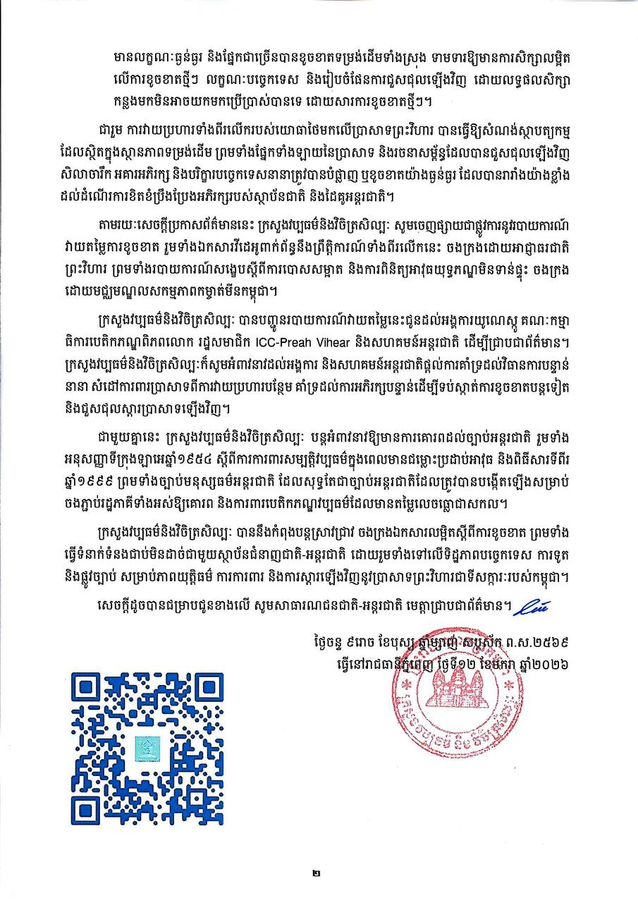 ក្រសួងវប្បធម៌ និងវិចិត្រសិល្បៈ បានចេញសេចក្តីប្រកាសព័ត៌មាន បង្ហាញពីស្ថានភាពខូចខាតនៅរមណីយដ្ឋានប្រាសាទព្រះវិហារ និងតំបន់ជុំវិញ ដោយសារការបាញ់ប្រហាររបស់យោធាថៃ កាលពីថ្ងៃទី២៤-២៨ ខែកក្កដាឆ្នាំ២០២៥ និងពីថ្ងៃទី៧-២៧ ខែធ្នូ ឆ្នាំ២០២៥។ នេះបើយោងតាមសេចក្តីប្រកាសព័ត៌មាន ដែលបណ្តាញព័ត៌មាន ទទួលបាន។